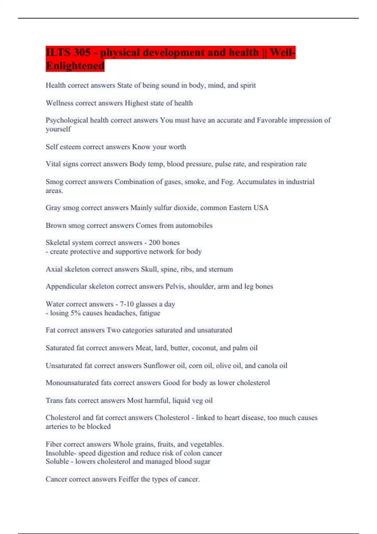 Health correct answers State of being sound in body, mind, and spirit Wellness correct answers Highest state of health Psychological health correct answers You must have an accurate and Favorable impression of yourself Self esteem correct answers Know your worth Vital signs correct answers Body temp, blood pressure, pulse rate, and respiration rate Smog correct answers Combination of gases, smoke, and Fog. Accumulates in industrial areas. Gray smog correct answers Mainly sulfur dioxide, common Eastern USA Brown smog correct answers Comes from automobiles Skeletal system correct answers - 200 bones - create protective and supportive network for body Axial skeleton correct answers Skull, spine, ribs, and sternum Appendicular skeleton correct answers Pelvis, shoulder, arm and leg bones Water correct answers - 7-10 glasses a day - losing 5% causes headaches, fatigue Fat correct answers Two categories saturated and unsaturated Saturated fat correct answers Meat, lard, butter, coconut, and palm oil Unsaturated fat correct answers Sunflower oil, corn oil, olive oil, and canola oil Monounsaturated fats correct answers Good for body as lower cholesterol Trans fats correct answers Most harmful, liquid veg oil Cholesterol and fat correct answers Cholesterol - linked to heart disease, too much causes arteries to be blocked Fiber correct answers Whole grains, fruits, and vegetables. Insoluble- speed digestion and reduce risk of colon cancer Soluble - lowers cholesterol and managed blood sugar Cancer correct answers Feiffer the types of cancer.
