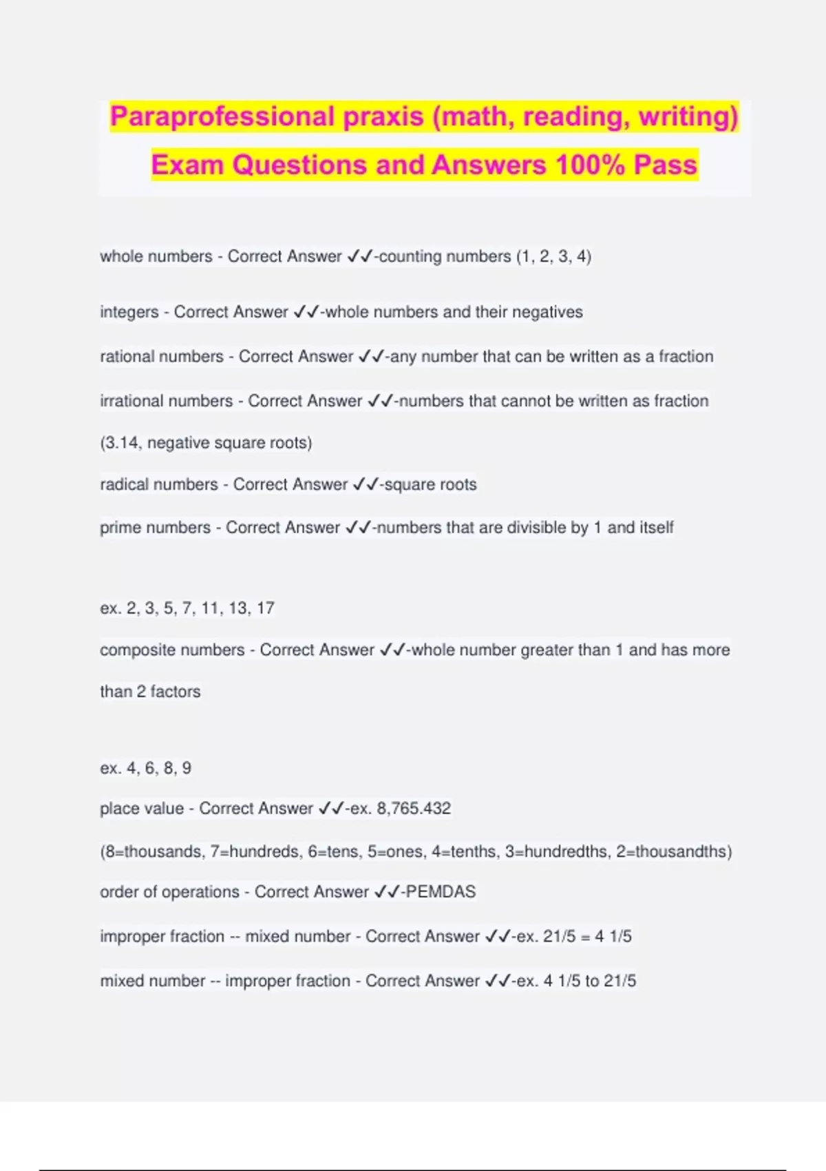 Paraprofessional praxis (math, reading, writing) Exam Questions and Answers 100% Pass whole numbers - Correct Answer ️️ -counting numbers (1, 2, 3, 4) integers - Correct Answer ️️ -whole numbers and their negatives rational numbers - Correct Answer ️️ -any number that can be written as a fraction irrational numbers - Correct Answer ️️ -numbers that cannot be written as fraction (3.14, negative square roots) radical numbers - Correct Answer ️️ -square roots prime numbers - Correct Answer ️️ -numbers that are divisible by 1 and itself ex. 2, 3, 5, 7, 11, 13, 17 composite numbers - Correct Answer ️️ -whole number greater than 1 and has more than 2 factors ex. 4, 6, 8, 9 place value - Correct Answer ️️ -ex. 8,765.432 (8=thousands, 7=hundreds, 6=tens, 5=ones, 4=tenths, 3=hundredths, 2=thousandths) order of operations - Correct Answer ️️ -PEMDAS improper fraction -- mixed number - Correct Answer ️️ -ex. 21/5 = 4 1/5 mixed number -- improper fraction - Correct Answer ️️ -ex. 4 1/5 to 21/5 multiple whole number (4) with denominator (5) and add numerator (1), put over denominator kilo - Correct Answer ️️ -thousand ex. 1 kilometer = 1000 meters deci - Correct Answer ️️ -tenth ex. 10 deciliters = 1 liter centi - Correct Answer ️️ -hundredth ex. 100 centimeters = 1 meter milli - Correct Answer ️️ -thousandth ex. 1000 milligrams = 1 gram miles -- feet - Correct Answer ️️ -1 mile = 5280 feet yard -- feet - Correct Answer ️️ -1 yard = 3 feet feet -- inches - Correct Answer ️️ -1 ft = 12 in gallon - Correct Answer ️️ -1 gallon = 4 quarts = 8 pints = 16 cups = 128 fluid oz pounds -- ounces - Correct Answer ️️ -1 pound = 16 ounces tons -- pounds - Correct Answer ️️ -1 ton = 2000 pounds inches -- cm - Correct Answer ️️ -1 inch = 2.54 cm miles -- kilometers - Correct Answer ️️ -1 mi = 1.61 km gallon -- liters - Correct Answer ️️ -1 gallon = 3.8 L liters -- cups - Correct Answer ️️ -1 liter = 4.2 cups kilogram -- pounds - Correct Answer ️️ -1 kg = 2.2 lbs scalene triangle - Correct Answer ️️ -a triangle with no congruent sides isosceles triangle - Correct Answer ️️ -a triangle with at least two congruent sides equilateral triangle - Correct Answer ️️ -a triangle with 3 congruent sides acute triangle - Correct Answer ️️ -a triangle with t
