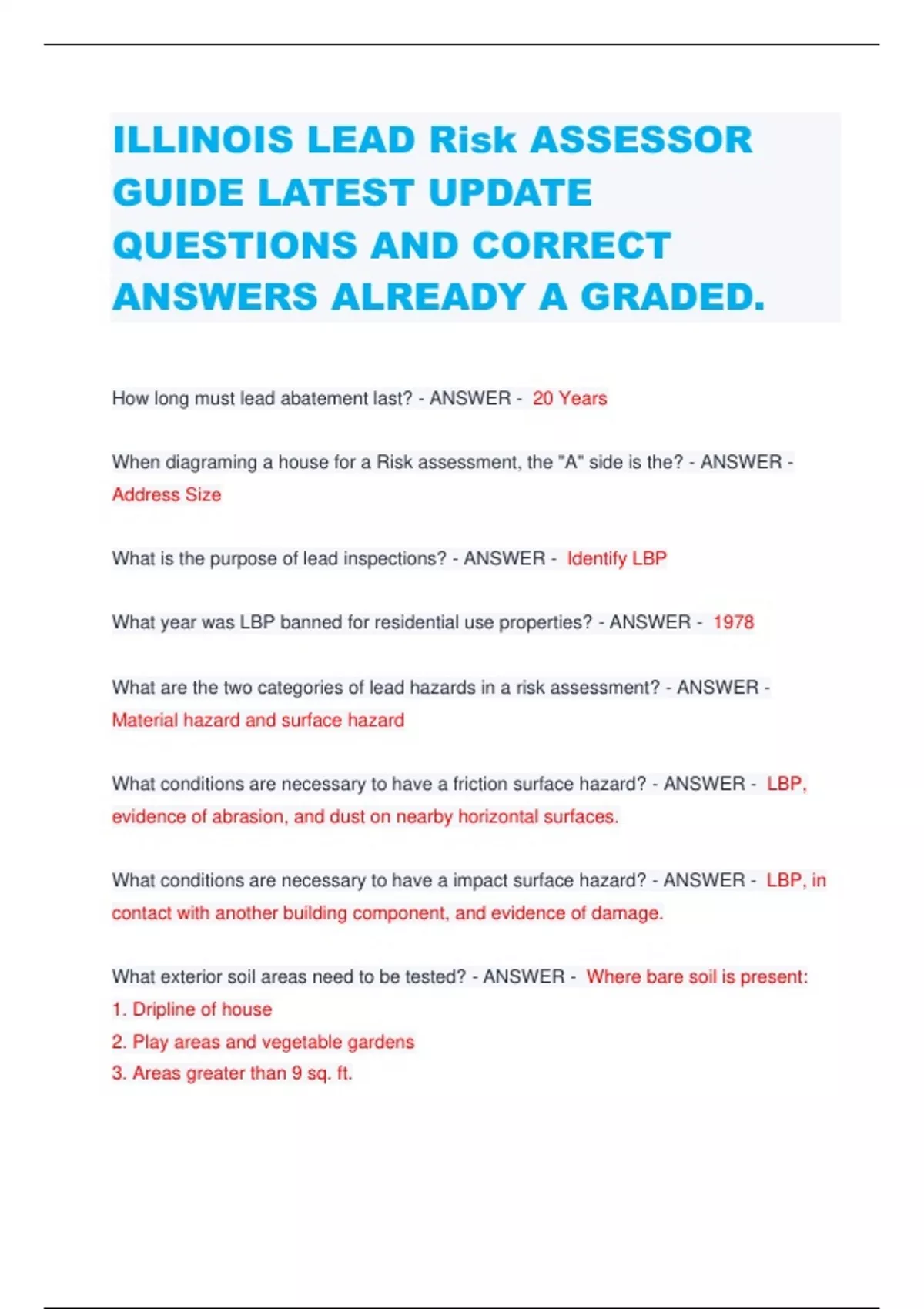 ILLINOIS LEAD Risk ASSESSOR GUIDE LATEST UPDATE QUESTIONS AND CORRECT ANSWERS ALREADY A GRADED.