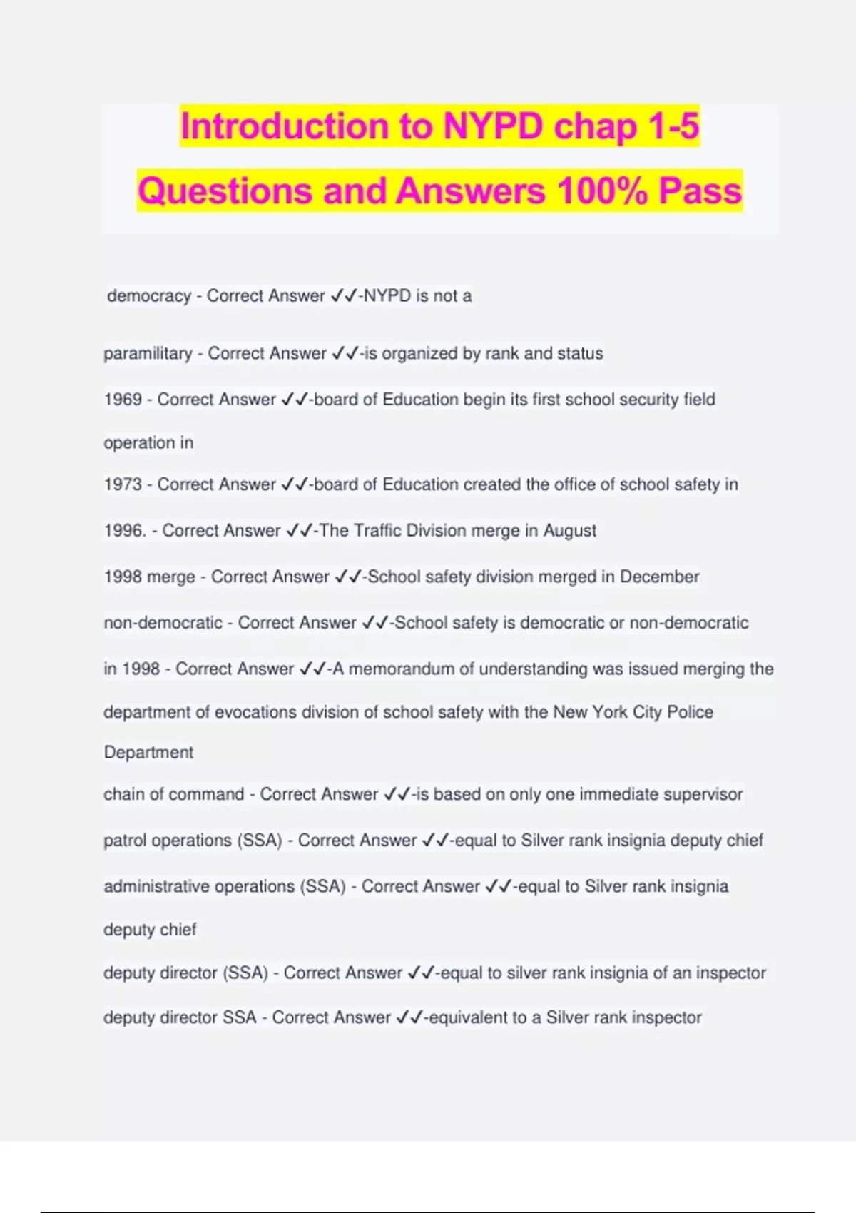Introduction to NYPD chap 1-5 Questions and Answers 100% Pass democracy - Correct Answer ️️ -NYPD is not a paramilitary - Correct Answer ️️ -is organized by rank and status 1969 - Correct Answer ️️ -board of Education begin its first school security field operation in 1973 - Correct Answer ️️ -board of Education created the office of school safety in 1996. - Correct Answer ️️ -The Traffic Division merge in August 1998 merge - Correct Answer ️️ -School safety division merged in December non-democratic - Correct Answer ️️ -School safety is democratic or non-democratic in 1998 - Correct Answer ️️ -A memorandum of understanding was issued merging the department of evocations division of school safety with the New York City Police Department chain of command - Correct Answer ️️ -is based on only one immediate supervisor patrol operations (SSA) - Correct Answer ️️ -equal to Silver rank insignia deputy chief administrative operations (SSA) - Correct Answer ️️ -equal to Silver rank insignia deputy chief deputy director (SSA) - Correct Answer ️️ -equal to silver rank insignia of an inspector deputy director SSA - Correct Answer ️️ -equivalent to a Silver rank inspector associate supervisor of school security level 2 = ASSS2 SSA - Correct Answer ️️ - equivalent to sober rank insignia of a deputy inspector (example doctor) associate supervisor of school safety level 1 = ASSS1 SSA - Correct Answer ️️ - equivalent to silver rank insignia of a captain (example a nurse) supervisor of school safety (SSS) SSA - Correct Answer ️️ -equivalent to silver rank insignia of a lieutenant School safety agent level 3 SSA - Correct Answer ️️ -equivalent to three sergeant stripes Chevron white on blue School safety agent level 2 SSA - Correct Answer ️️ -equivalent to No rank insignia stripe (is a mobile task force) School safety agent SSA - Correct Answer ️️ -no rank insignia stripes police commissioner NYPD - Correct Answer ️️ -have five stars and is equivalent to a member of service = MOS, known as a civilian member of service, highest ranking Savalia, he is appointed by the mayor deputy Commissioner NYPD - Correct Answer ️️ -have 3-4 stars chief of department. NYPD - Correct Answer ️️ -has four stars and is the highest ranking uniform member of service bureau chief NYPD - Correct Answer ️️ -have 2 stars and Service nine commanders including Bronx east and west Captain NYPD - Correct Answer ️️ -highest civil service rank why can I police officer do that a school safety can not - Correct Answer ️️ -stop and frisk what is the job of a school safety agent - Correct Answer ️️ -to maintain order three decorate director and school safety division - Correct Answer ️️ -so who oversee operational activities for the nine SSD borrow command Brooklyn north and south, queen north and south, Manhattan North and south, Bronx east and west and Staten Island how many command - Correct Answer ️️ -9 because Bronx east and west how many patrol borough - Correct Answer ️️ -8