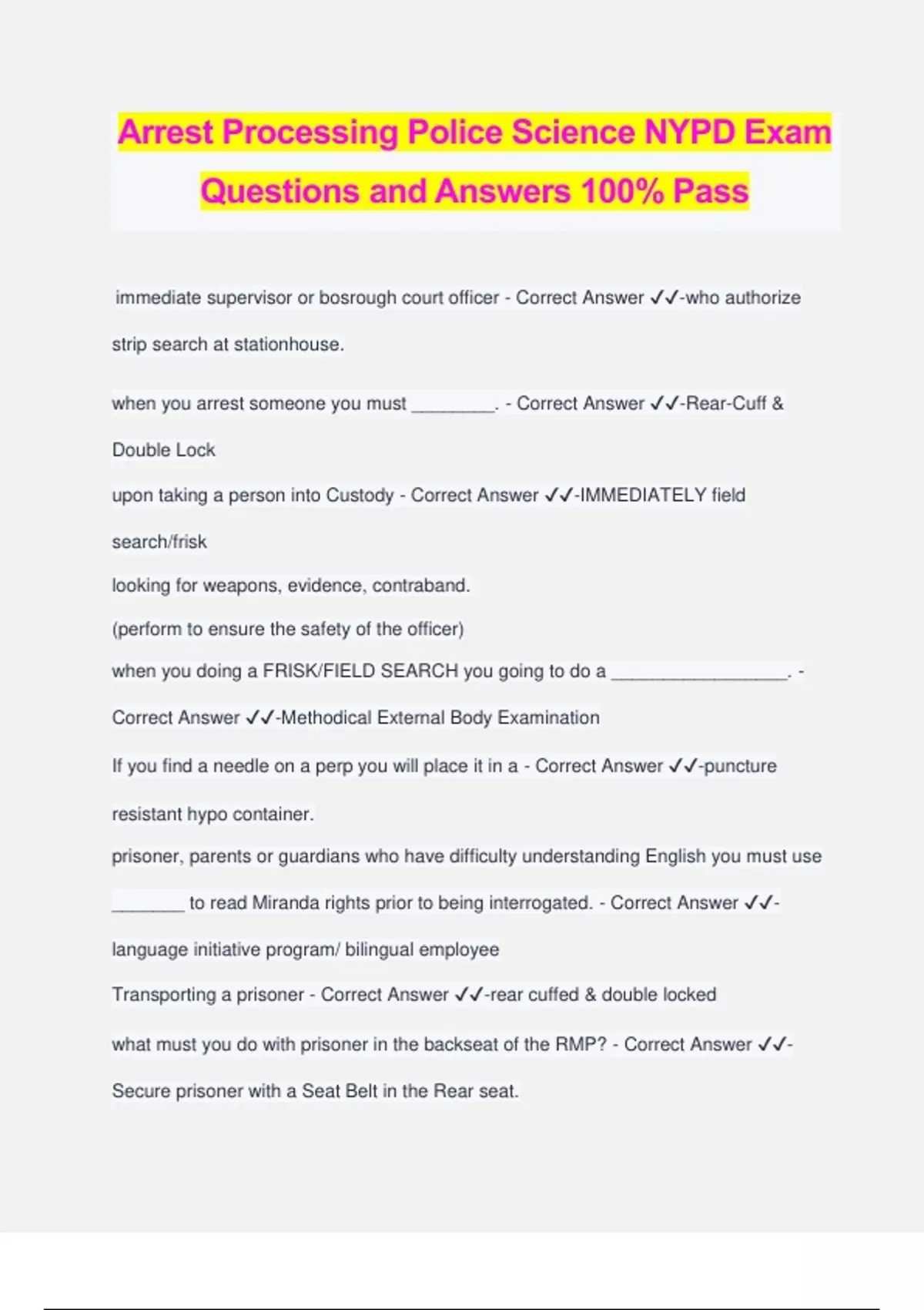 Arrest Processing Police Science NYPD Exam Questions and Answers 100% Pass