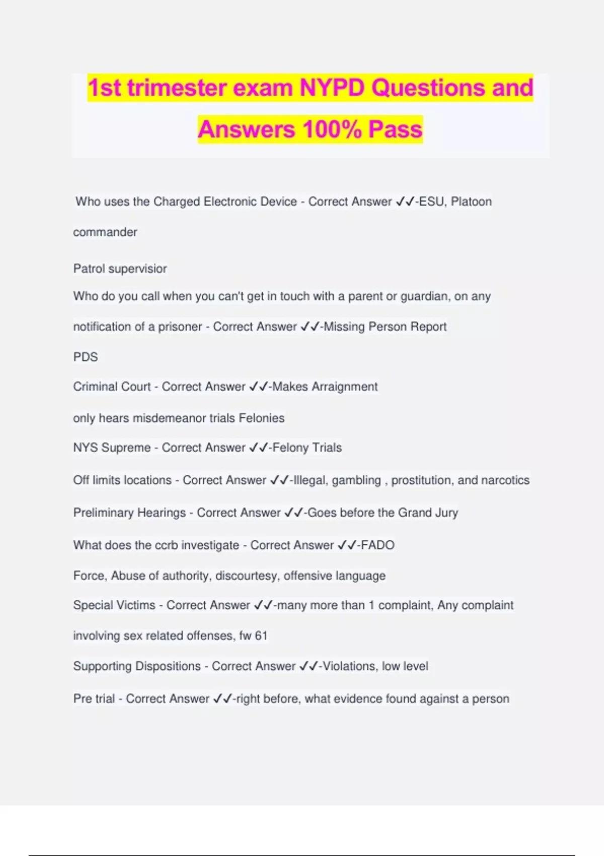 1st trimester exam NYPD Questions and Answers 100% Pass