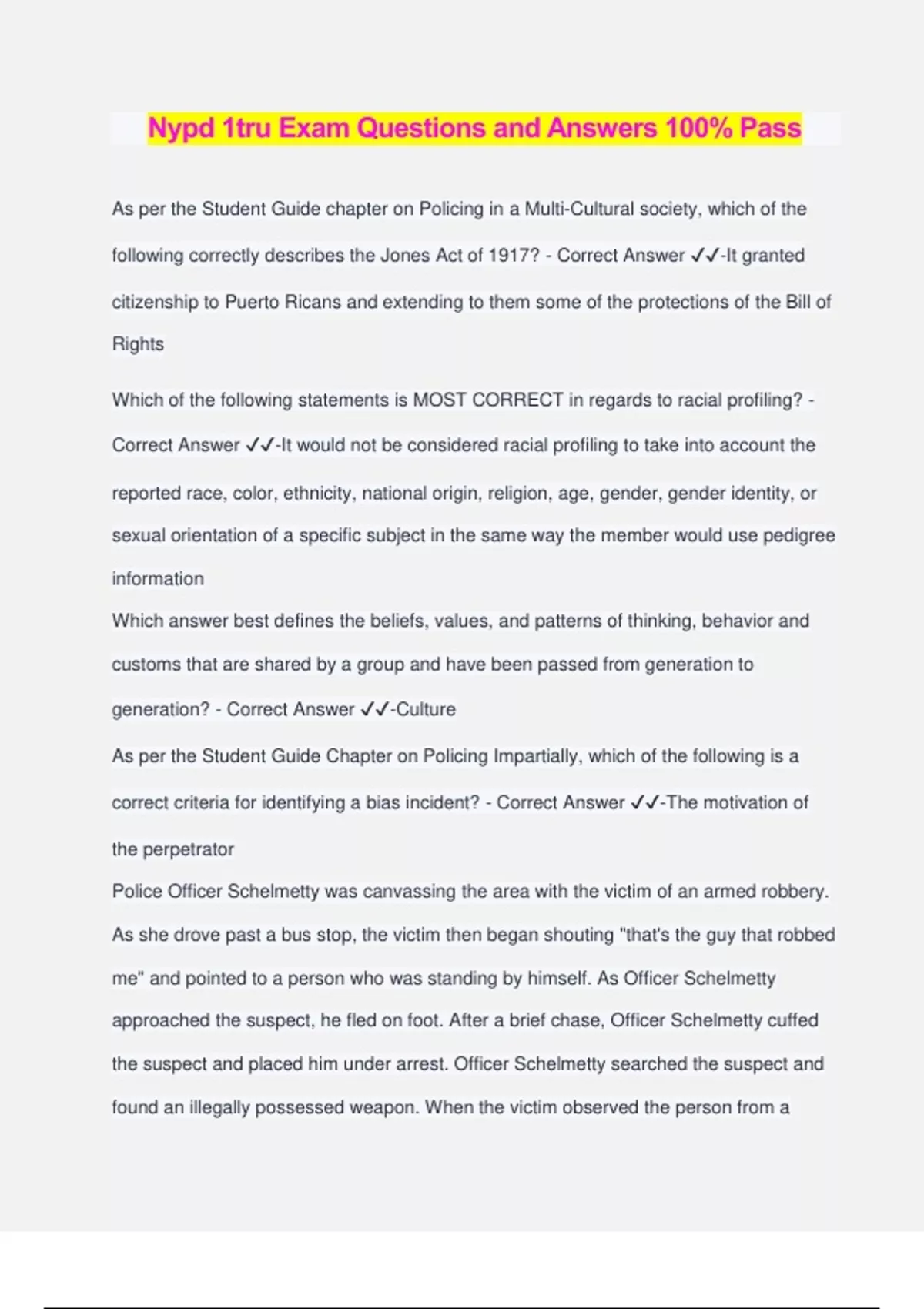 Nypd 1tru Exam Questions and Answers 100% Pass As per the Student Guide chapter on Policing in a Multi-Cultural society, which of the following correctly describes the Jones Act of 1917? - Correct Answer ️️ -It granted citizenship to Puerto Ricans and extending to them some of the protections of the Bill of Rights Which of the following statements is MOST CORRECT in regards to racial profiling? - Correct Answer ️️ -It would not be considered racial profiling to take into account the reported race, color, ethnicity, national origin, religion, age, gender, gender identity, or sexual orientation of a specific subject in the same way the member would use pedigree information Which answer best defines the beliefs, values, and patterns of thinking, behavior and customs that are shared by a group and have been passed from generation to generation? - Correct Answer ️️ -Culture As per the Student Guide Chapter on Policing Impartially, which of the following is a correct criteria for identifying a bias incident? - Correct Answer ️️ -The motivation of the perpetrator Police Officer Schelmetty was canvassing the area with the victim of an armed robbery. As she drove past a bus stop, the victim then began shouting "that's the guy that robbed me" and pointed to a person who was standing by himself. As Officer Schelmetty approached the suspect, he fled on foot. After a brief chase, Officer Schelmetty cuffed the suspect and placed him under arrest. Officer Schelmetty searched the suspect and found an illegally possessed weapon. When the victim observed the person from a closer distance, she stated, "I made a mistake. That's not the man who robbed me." Select the CORRECT statement based on the above facts. - Correct Answer ️️ -The weapon will be admitted into evidence because the initial arrest was based on probable cause Which of the following phrases should be used when communicating with someone according to the NYPD student guide? - Correct Answer ️️ -I'll try and help you Commercial burglaries in which the value of the stolen property exceeds $100,000 must be referred to which of the following? - Correct Answer ️️ -Major Case Unit. Which of the following statements satisfies the second prong of the Aguilar Spinelli Two Prong Test? - Correct Answer ️️ -The informant states that they obtained the information by personal observation of the suspect or in direct conversation with the suspect To assure that Department policy concerning sick leave is not abused, which of the following has been established? - Correct Answer ️️ -Chronic Absence Control Program When preparing a Complaint Report it would be correct to state which of the following statements? - Correct Answer ️️ -A complaint of a 15 year old robbed on school grounds outside the school building will be classified as a Department of Education incident When a police officer responds to a 10-11 (alarm) and determine that the transmission was unnecessary, the police officer will prepare a: - Correct Answer ️️ -Notice of Unnecessary Alarm PO Johnson is assigned to sector Adam within the confines of the 69th precinct. He receives an anonymous/unverified call from central of a man with a firearm. As he approaches the scene he notices a man that matches the description provided by the 911 call. With no other details available, select the most CORRECT statement: - Correct Answer ️️ -PO Johnson may approach the individual and ask consent to search A police officer was approached by a person who was bleeding from his nose and stated that while he was walking home a group of youths stopped him and called him a gay homosexual. They then proceeded to punch the person with their fists causing injuries. The officer should: - Correct Answer ️️ -Request the Patrol Supervisor as this may be a bias-motivated incident. Which of the following would be referred to the Precinct Detective Squad for further investigation - Correct Answer ️️ -Any offense where t