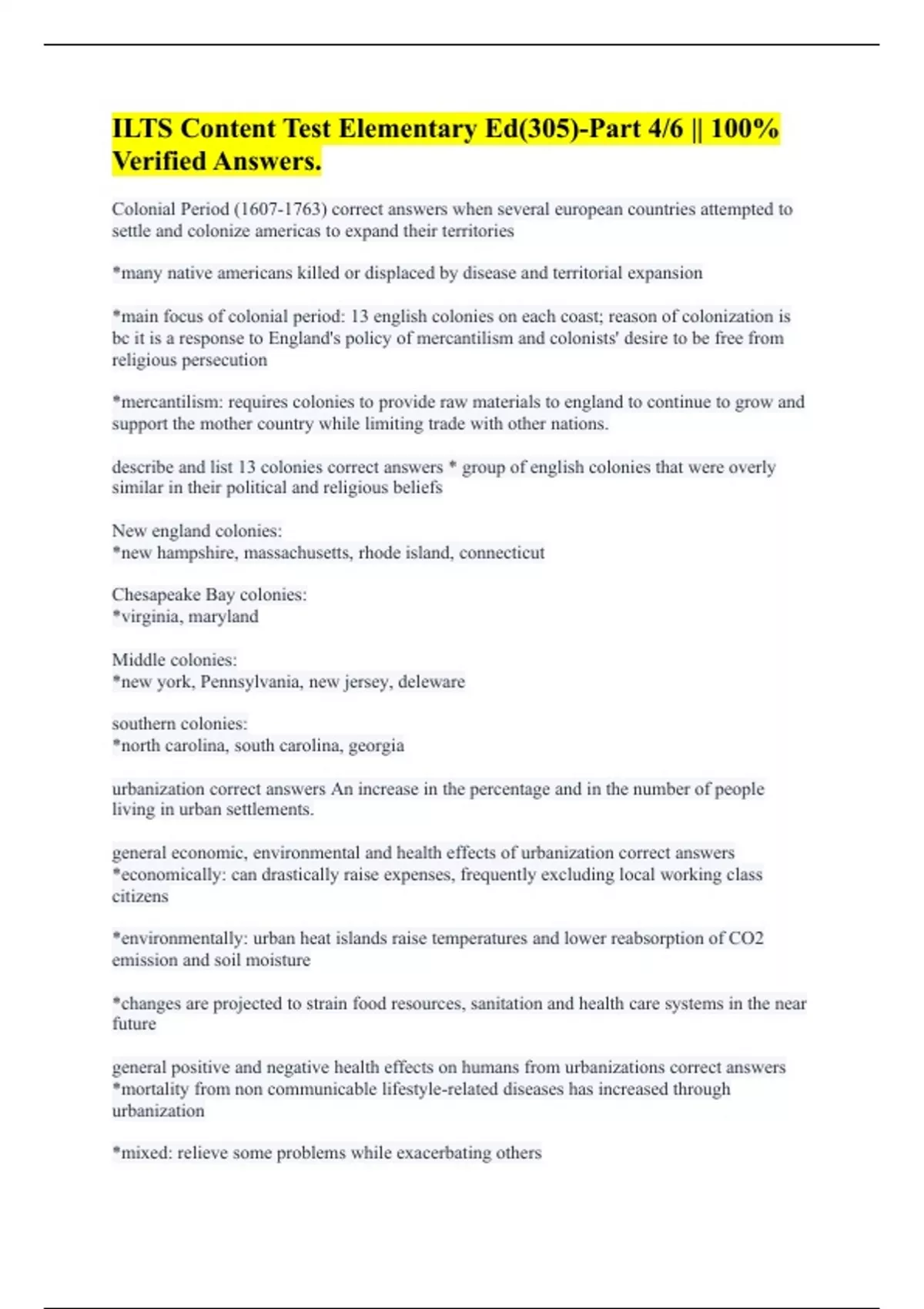 Colonial Period () correct answers when several european countries attempted to settle and colonize americas to expand their territories *many native americans killed or displaced by disease and territorial expansion *main focus of colonial period: 13 english colonies on each coast; reason of colonization is bc it is a response to England's policy of mercantilism and colonists' desire to be free from religious persecution *mercantilism: requires colonies to provide raw materials to england to continue to grow and support the mother country while limiting trade with other nations. describe and list 13 colonies correct answers * group of english colonies that were overly similar in their political and religious beliefs New england colonies: *new hampshire, massachusetts, rhode island, connecticut Chesapeake Bay colonies: *virginia, maryland Middle colonies: *new york, Pennsylvania, new jersey, deleware southern colonies: *north carolina, south carolina, georgia urbanization correct answers An increase in the percentage and in the number of people living in urban settlements. general economic, environmental and health effects of urbanization correct answers *economically: can drastically raise expenses, frequently excluding local working class citizens *environmentally: urban heat islands raise temperatures and lower reabsorption of CO2 emission and soil moisture *changes are projected to strain food resources, sanitation and health care systems in the near future general positive and negative health effects on humans from urbanizations correct answers *mortality from non communicable lifestyle-related diseases has increased through urbanization *mixed: relieve some problems while exacerbating others