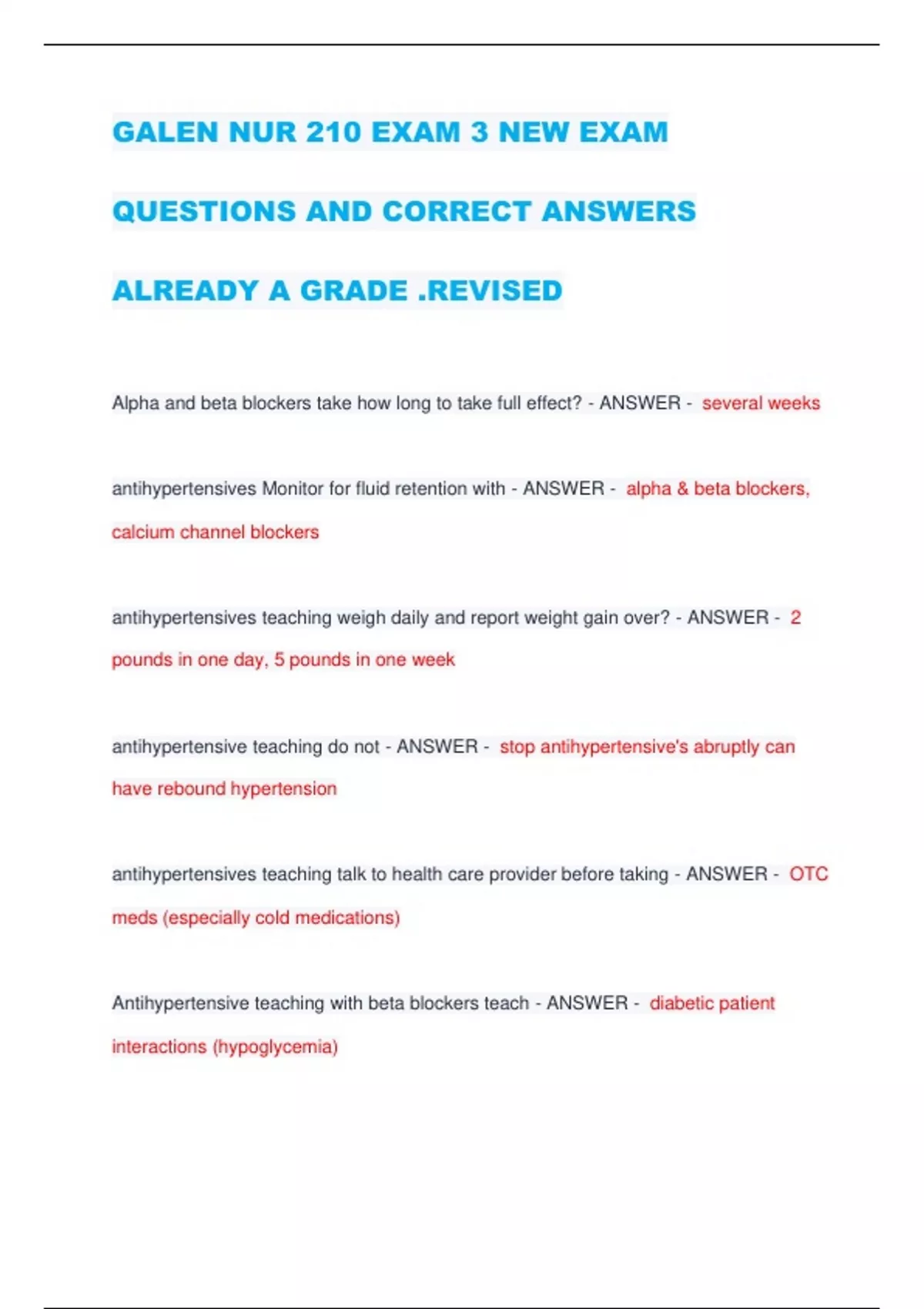 GALEN NUR 210 EXAM 3 NEW EXAM QUESTIONS AND CORRECT ANSWERS ALREADY A GRADE .REVISED Alpha and beta blockers take how long to take full effect? - ANSWER - several weeks antihypertensives Monitor for fluid retention with - ANSWER - alpha & beta blockers, calcium channel blockers antihypertensives teaching weigh daily and report weight gain over? - ANSWER - 2 pounds in one day, 5 pounds in one week antihypertensive teaching do not - ANSWER - stop antihypertensive's abruptly can have rebound hypertension antihypertensives teaching talk to health care provider before taking - ANSWER - OTC meds (especially cold medications)