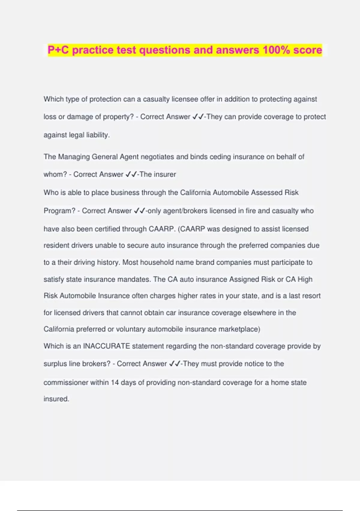 P+C practice test questions and answers 100% score Which type of protection can a casualty licensee offer in addition to protecting against loss or damage of property? - Correct Answer ️️ -They can provide coverage to protect against legal liability. The Managing General Agent negotiates and binds ceding insurance on behalf of whom? - Correct Answer ️️ -The insurer Who is able to place business through the California Automobile Assessed Risk Program? - Correct Answer ️️ -only agent/brokers licensed in fire and casualty who have also been certified through CAARP. (CAARP was designed to assist licensed resident drivers unable to secure auto insurance through the preferred companies due to a their driving history. Most household name brand companies must participate to satisfy state insurance mandates. The CA auto insurance Assigned Risk or CA High Risk Automobile Insurance often charges higher rates in your state, and is a last resort for licensed drivers that cannot obtain car insurance coverage elsewhere in the California preferred or voluntary automobile insurance marketplace) Which is an INACCURATE statement regarding the non-standard coverage provide by surplus line brokers? - Correct Answer ️️ -They must provide notice to the commissioner within 14 days of providing non-standard coverage for a home state insured. All of the following are taken into consideration for California Automobile Assigned Risk Program eligibility for applicants EXCEPT - Correct Answer ️️ -the education of the applicant. Who must be able to inspect records of insurance transactions made available by agent-brokers at any time? - Correct Answer ️️ -the insurance commissioner All of the following are PRINCIPAL rating factors in determining automobile insurance premiums EXCEPT - Correct Answer ️️ -the zip code where the vehicle is housed. Where must the address be printed for the principal office that is required for every broker agent and resident insurance casualty broker-agent? - Correct Answer ️️ - applications for license and renewals All of the following are reasons employers liability insurance is needed in addition to workers' compensation insurance EXCEPT - Correct Answer ️️ -to pay medical bills. When can a person who sells real property require the use of a specific insurance agent, broker or solicitor? - Correct Answer ️️ -A buyer is always able to choose their own insurance representative. What criteria must a person meet in order to be qualified to purchase a Good Driver Discount policy? - Correct Answer ️️ -Being licensed to drive a motor vehicle for the previous 3 years and has not had more than one violation point count as determined by the CIC. All of the following are designated as private passenger vehicles EXCEPT - Correct Answer ️️ -a four wheel vehicle used as a taxi by an individual and not a company. What is the required rate discount under a Good Driver Discount policy? - Correct Answer ️️ -20% below the rate the insured would have been otherwise charged for the same coverage. To which person or organization does a public insurance adjuster promote and represent? - Correct Answer ️️ -the insured Which of the following is TRUE regarding the application and renewal of the limited lines automobile insurance agent license? - Correct Answer ️️ -The fees and process are the same as for a personal lines licensee. When is it possible for a commercial vehicle to be eligible for coverage under the California Automobile Assigned Risk Program? - Correct Answer ️️ -if it is a privately owned lightweight commercial vehicle used for local service or retail deliveries within a specific geographic area All of the following apply to "Approval of Insurance Rates" EXCEPT - Correct Answer ️️ -the commissioner shall notify the public of a rate change after it has been approved. What must an individual do in order to act as an agent for a business entity or insurer offering limited lines automobile coverage? - Correct Answer ️️ -file a notice of appointment with the commissioner Which is NOT a duty of the Workers Compensation Bureau? - Correct Answer ️️ - Determine which claims are approved and which are denied. What possible consequences are faced from the insurance commissioner by an agent or broker who does not within 60 days comply with an order to establish and complete records? - Correct Answer ️️ -a suspension or revocation of license What is the procedure for refusing uninsured motorist coverage in a liability policy? - Correct Answer ️️ -Prior to issuance or renewal, the insured may state in writing that they do not want the coverage. All of the following are requirements for determining an area that qualifies for Low Cost Automobile Insurance EXCEPT - Correct Answer ️️ -the nu