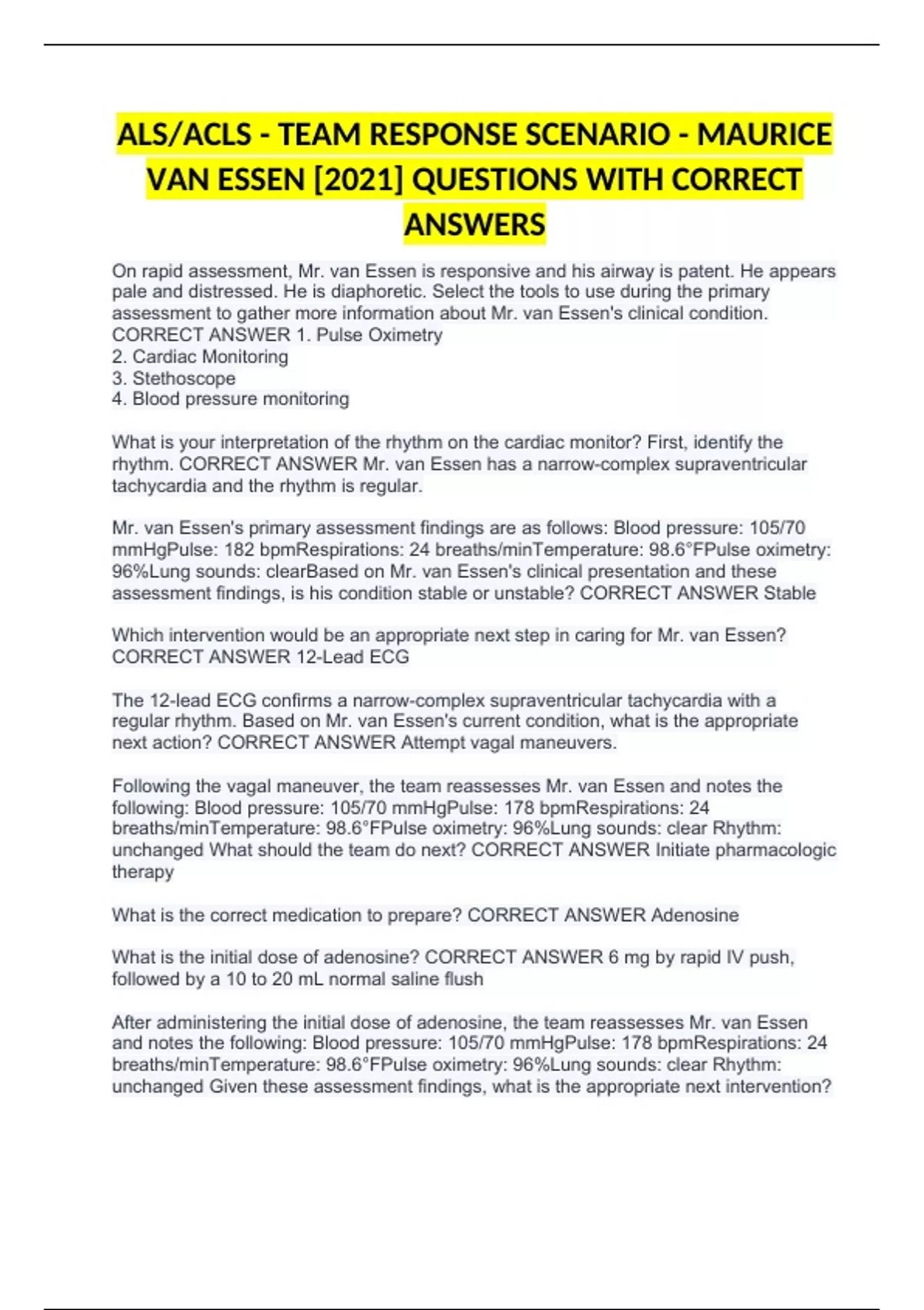 ALS/ACLS - TEAM RESPONSE SCENARIO - MAURICE VAN ESSEN [2021] QUESTIONS WITH CORRECT ANSWERS|100% verified