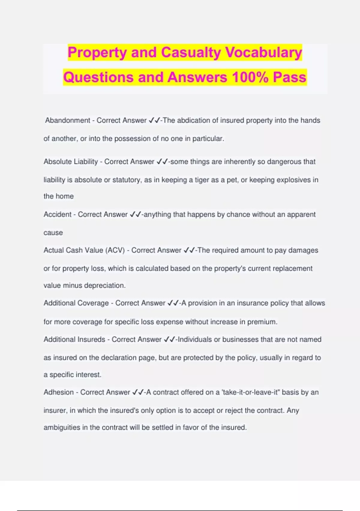 Property and Casualty Vocabulary Questions and Answers 100% Pass Abandonment - Correct Answer ️️ -The abdication of insured property into the hands of another, or into the possession of no one in particular. Absolute Liability - Correct Answer ️️ -some things are inherently so dangerous that liability is absolute or statutory, as in keeping a tiger as a pet, or keeping explosives in the home Accident - Correct Answer ️️ -anything that happens by chance without an apparent cause Actual Cash Value (ACV) - Correct Answer ️️ -The required amount to pay damages or for property loss, which is calculated based on the property's current replacement value minus depreciation. Additional Coverage - Correct Answer ️️ -A provision in an insurance policy that allows for more coverage for specific loss expense without increase in premium. Additional Insureds - Correct Answer ️️ -Individuals or businesses that are not named as insured on the declaration page, but are protected by the policy, usually in regard to a specific interest. Adhesion - Correct Answer ️️ -A contract offered on a 'take-it-or-leave-it" basis by an insurer, in which the insured's only option is to accept or reject the contract. Any ambiguities in the contract will be settled in favor of the insured. Admitted Insurer - Correct Answer ️️ -An insurance company authorized and licensed to transact business in a particular state. Adverse Selection - Correct Answer ️️ -The tendency of risks with higher probability of loss to purchase and maintain insurance more often than the risks who present lower probability. Agent - Correct Answer ️️ -a businessman who buys or sells for another in exchange for a commission Aggregate Limit - Correct Answer ️️ -The total maximum amount that the insurer will pay during a policy period, usually one year, regardless of the number of incidents, claims, claimants or defendants. Agreed Value - Correct Answer ️️ -Agreed value is a property policy containing a condition agreed upon by the insurer and the insured regarding the amount of insurance that represents a fair valuation of the property at the time the insurance is written. Alien Insurer - Correct Answer ️️ -An insurance company that is incorporated outside the United States. Apparent Authority - Correct Answer ️️ -The appearance or the assumption of authority based on the actions, words, or deeds of the principal or because of circumstances the principal created. Appraisal - Correct Answer ️️ -a document appraising the value of something (as for insurance or taxation) Arbitration - Correct Answer ️️ -Method of claim settlement used when the insured and the insurer cannot agree upon the amount of the loss. Assignment - Correct Answer ️️ -The transfer of a legal right or interest in an insurance policy. In property and casualty insurance, assignments of policies are usually valid only with the prior written consent on the insurer. Authorized Insurer - Correct Answer ️️ -An insurance company that has qualified and received a Certificate of Authority from the Department of Insurance to transact insurance in the state. Auto - Correct Answer ️️ -A land motor vehicle, trailer or semi-trailer designed for use on public roads, including attached machinery or equipment; auto does not include mobile equipment. Avoidance - Correct Answer ️️ -A method of dealing with risk by deliberately keeping away from it (e.g. if a person wanted to avoid the risk