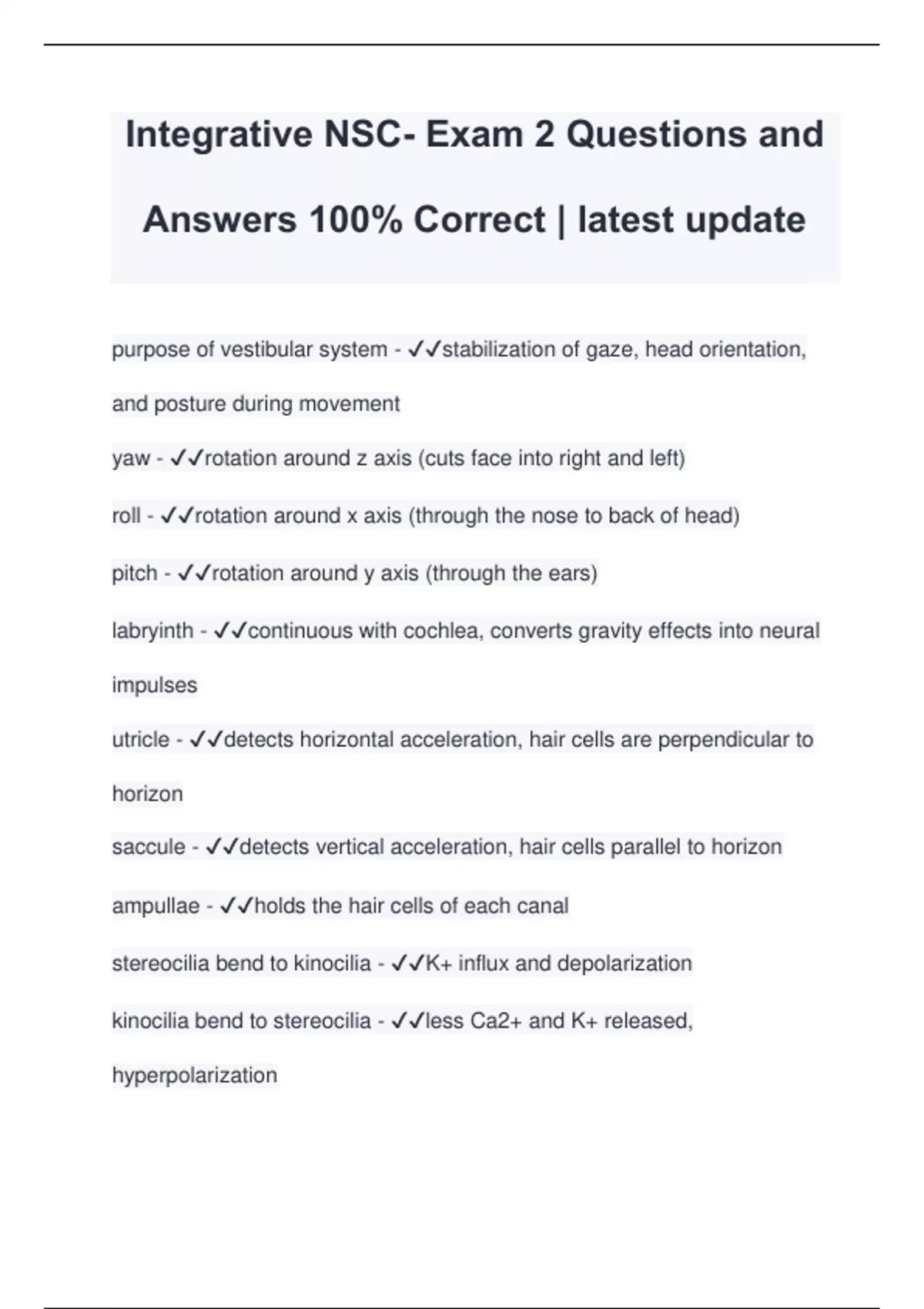 Integrative NSC- Exam 2 Questions and Answers 100% Correct | latest update purpose of vestibular system - stabilization of gaze, head orientation, and posture during movement yaw - rotation around z axis (cuts face into right and left) roll - rotation around x axis (through the nose to back of head) pitch - rotation around y axis (through the ears) labryinth - continuous with cochlea, converts gravity effects into neural impulses utricle - detects horizontal acceleration, hair cells are perpendicular to horizon saccule - detects vertical acceleration, hair cells parallel to horizon ampullae - holds the hair cells of each canal stereocilia bend to kinocilia - K+ influx and depolarization kinocilia bend to stereocilia - less Ca2+ and K+ released, hyperpolarization