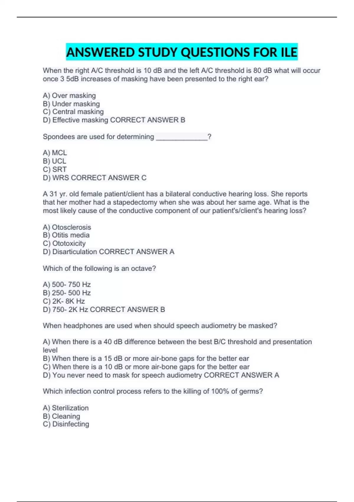 ANSWERED STUDY QUESTIONS FOR ILE When the right A/C threshold is 10 dB and the left A/C threshold is 80 dB what will occur once 3 5dB increases of masking have been presented to the right ear? A) Over masking B) Under masking C) Central masking D) Effective masking CORRECT ANSWER B Spondees are used for determining _____________? A) MCL B) UCL C) SRT D) WRS CORRECT ANSWER C A 31 yr. old female patient/client has a bilateral conductive hearing loss. She reports that her mother had a stapedectomy when she was about her same age. What is the most likely cause of the conductive component of our patient's/client's hearing loss? A) Otosclerosis B) Otitis media C) Ototoxicity D) Disarticulation CORRECT ANSWER A Which of the following is an octave? A) 500- 750 Hz B) 250- 500 Hz C) 2K- 8K Hz D) 750- 2K Hz CORRECT ANSWER B When headphones are used when should speech audiometry be masked? A) When there is a 40 dB difference between the best B/C threshold and presentation level B) When there is a 15 dB or more air-bone gaps for the better ear C) When there is a 10 dB or more air-bone gaps for the better ear D) You never need to mask for speech audiometry CORRECT ANSWER A Which infection control process refers to the killing of 100% of germs? A) Sterilization B) Cleaning C) Disinfecting D) None of the above CORRECT ANSWER A When a patient/client reports difficulty hearing words like sip/tip/ship, but can hear words like door/floor/more. Where would the hearing healthcare provider expect there to be a hearing loss on the audiogram? A) Hearing loss in the high frequencies B) Hearing loss in the mid frequencies C) Hearing loss in the low frequencies D) Degree of hearing loss cannot be determined from speech results CORRECT ANSWER A Which of the following is the preferred order for audiometric testing? A) MCL before WRS B) Bone conduction before air conduction C) Speech UCL before SRT D) 500 Hz before 1K Hz CORRECT ANSWER A Which frequencies are usually affected when a noise induced hearing loss is suspected? A) 250- 750 Hz B) Hz C) Hz D) 750- 1500 Hz CORRECT ANSWER C Which of the following statements is most true about the use of gloves? A) Latex gloves should be used for ear impressioning B) Gloves can be saved to be used during a different appointment with the same patient/client C) Gloves are considered one-time use and should be disposed of after each use D) Gloves can be cleaned and reused if properly sanitized in cold soak bath CORRECT ANSWER C When the bone conduction threshold is 15 dB or better than the air conduction threshold what action should occur? A) Mask all bone conduction thresholds B) Apply appropriate masking to NTE to obtained masked bone conduction threshold C) Apply appropriate masking to NTE to obtained masked air conduction threshold D) Immediate medical referral for air-bone gaps CORRECT ANSWER B Why is it important to determine if there is a PTA/SRT discrepancy? A) To determine dynamic range B) To determine level for MCL which effects the level for WRS testing C) To determine if malingering or misunderstanding of directions is occurring during pure tones D) To determine needs for masking pure tones CORRECT ANSWER C When establishing UCL/LDL/TD it is important that _______________________________. A) The face is observed for any discomfort (grimace, eyebrows, raise, etc.) B) They indicate when the sound is slightly loud C) They indicate when the sound is unbearable D) They indicate when the sound is comfortable CORRECT ANSWER A Using the audiogram, what type of hearing loss is indicated for the left ear? (Audiogram shows mild to severe sloping SNHL AD and a flat mild CDHL AS) A) Normal hearing B) Mixed hearing loss C) Conductive hearing loss D) Sensorineural hearing loss CORRECT ANSWER C When masking for air-conduction the initial masking level is how many dB greater than the NTE threshold? A) 10 dB B) 20 dB C) 40 dB D) 0 dB CORRECT ANSWER A
