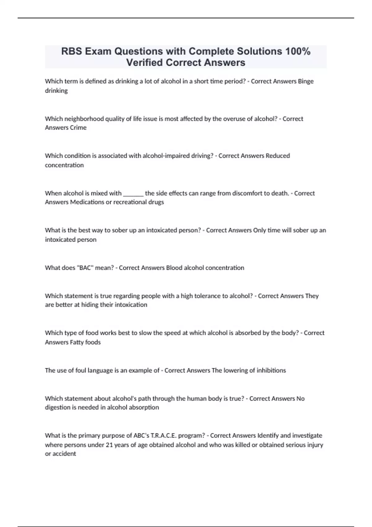 RBS Exam Questions with Complete Solutions 100% Verified Correct Answers Which term is defined as drinking a lot of alcohol in a short time period? - Correct Answers Binge drinking Which neighborhood quality of life issue is most affected by the overuse of alcohol? - Correct Answers Crime Which condition is associated with alcohol-impaired driving? - Correct Answers Reduced concentration When alcohol is mixed with ______ the side effects can range from discomfort to death. - Correct Answers Medications or recreational drugs What is the best way to sober up an intoxicated person? - Correct Answers Only time will sober up an intoxicated person What does "BAC" mean? - Correct Answers Blood alcohol concentration Which statement is true regarding people with a high tolerance to alcohol? - Correct Answers They are better at hiding their intoxication Which type of food works best to slow the speed at which alcohol is absorbed by the body? - Correct Answers Fatty foods The use of foul language is an example of - Correct Answers The lowering of inhibitions Which statement about alcohol's path through the human body is true? - Correct Answers No digestion is needed in alcohol absorption What is the primary purpose of ABC's T.R.A.C.E. program? - Correct Answers Identify and investigate where persons under 21 years of age obtained alcohol and who was killed or obtained serious injury or accident It is unlawful for a person who has _____ percent or more, by weight, of alcohol in his/her blood to drive a vehicle. - Correct Answers 0.08