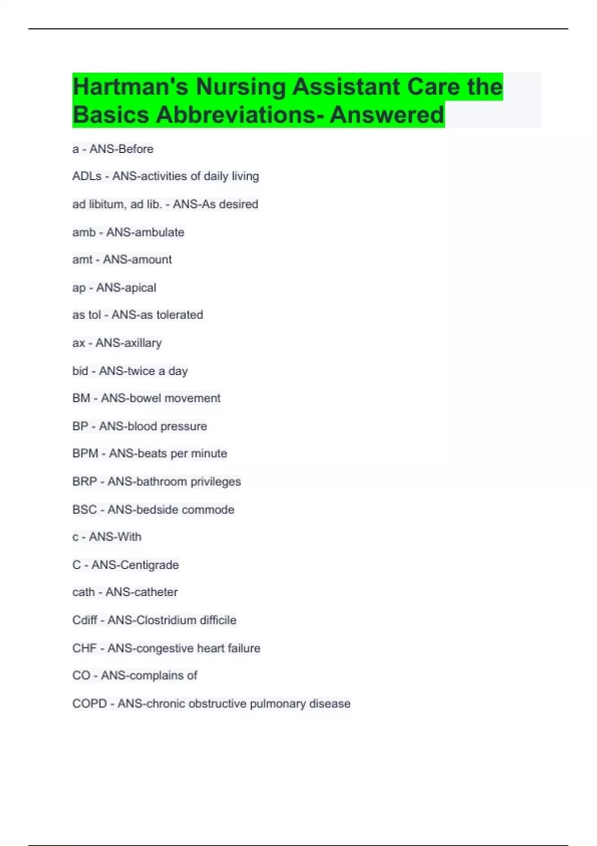 Hartman's Nursing Assistant Care the Basics Abbreviations- Answered