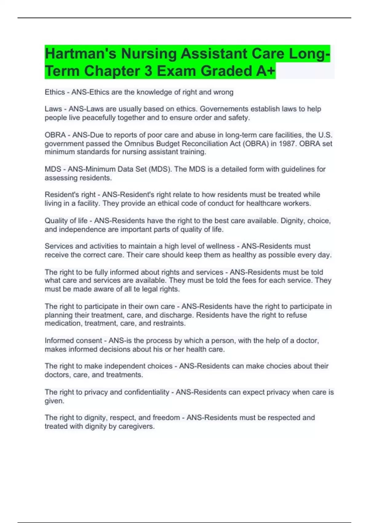 Hartman's Nursing Assistant Care Long-Term Chapter 3 Exam Graded A+