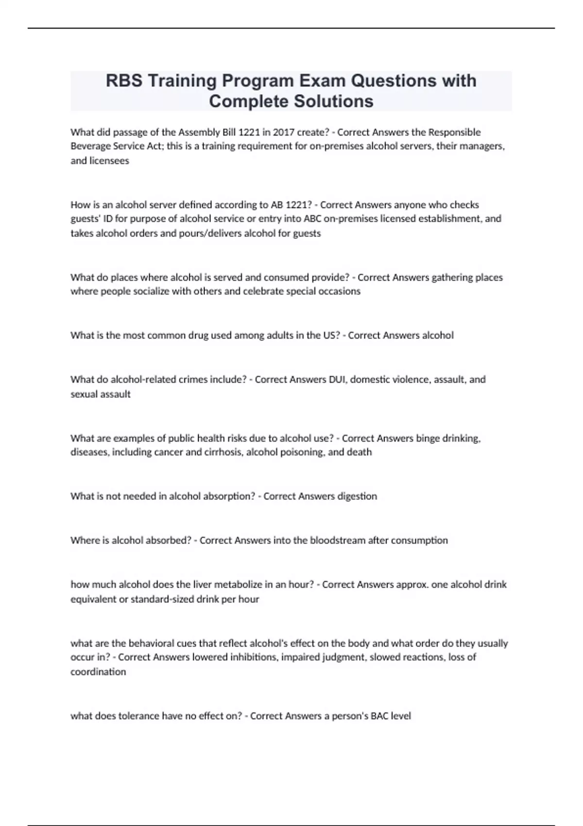 RBS Training Program Exam Questions with Complete Solutions What did passage of the Assembly Bill 1221 in 2017 create? - Correct Answers the Responsible Beverage Service Act; this is a training requirement for on-premises alcohol servers, their managers, and licensees How is an alcohol server defined according to AB 1221? - Correct Answers anyone who checks guests' ID for purpose of alcohol service or entry into ABC on-premises licensed establishment, and takes alcohol orders and pours/delivers alcohol for guests What do places where alcohol is served and consumed provide? - Correct Answers gathering places where people socialize with others and celebrate special occasions What is the most common drug used among adults in the US? - Correct Answers alcohol What do alcohol-related crimes include? - Correct Answers DUI, domestic violence, assault, and sexual assault What are examples of public health risks due to alcohol use? - Correct Answers binge drinking, diseases, including cancer and cirrhosis, alcohol poisoning, and death What is not needed in alcohol absorption? - Correct Answers digestion Where is alcohol absorbed? - Correct Answers into the bloodstream after consumption how much alcohol does the liver metabolize in an hour? - Correct Answers approx. one alcohol drink equivalent or standard-sized drink per hour what are the behavioral cues that reflect alcohol's effect on the body and what order do they usually occur in? - Correct Answers lowered inhibitions, impaired judgment, slowed reactions, loss of coordination what does tolerance have no effect on? - Correct Answers a person's BAC level what do daily drinkers who drink heavily develop? - Correct Answers a high tolerance for alcohol, giving them the ability to hide the behavioral cues that might normally indicate they are intoxicated what are myths about ways to sober up? - Correct Answers drinking coffee, taking cold showers, eating fatty foods, and throwing up what are the six intoxication rate factors? - Correct Answers physical size, rate of consumption, gender, strength of drink, food intake, and drug use