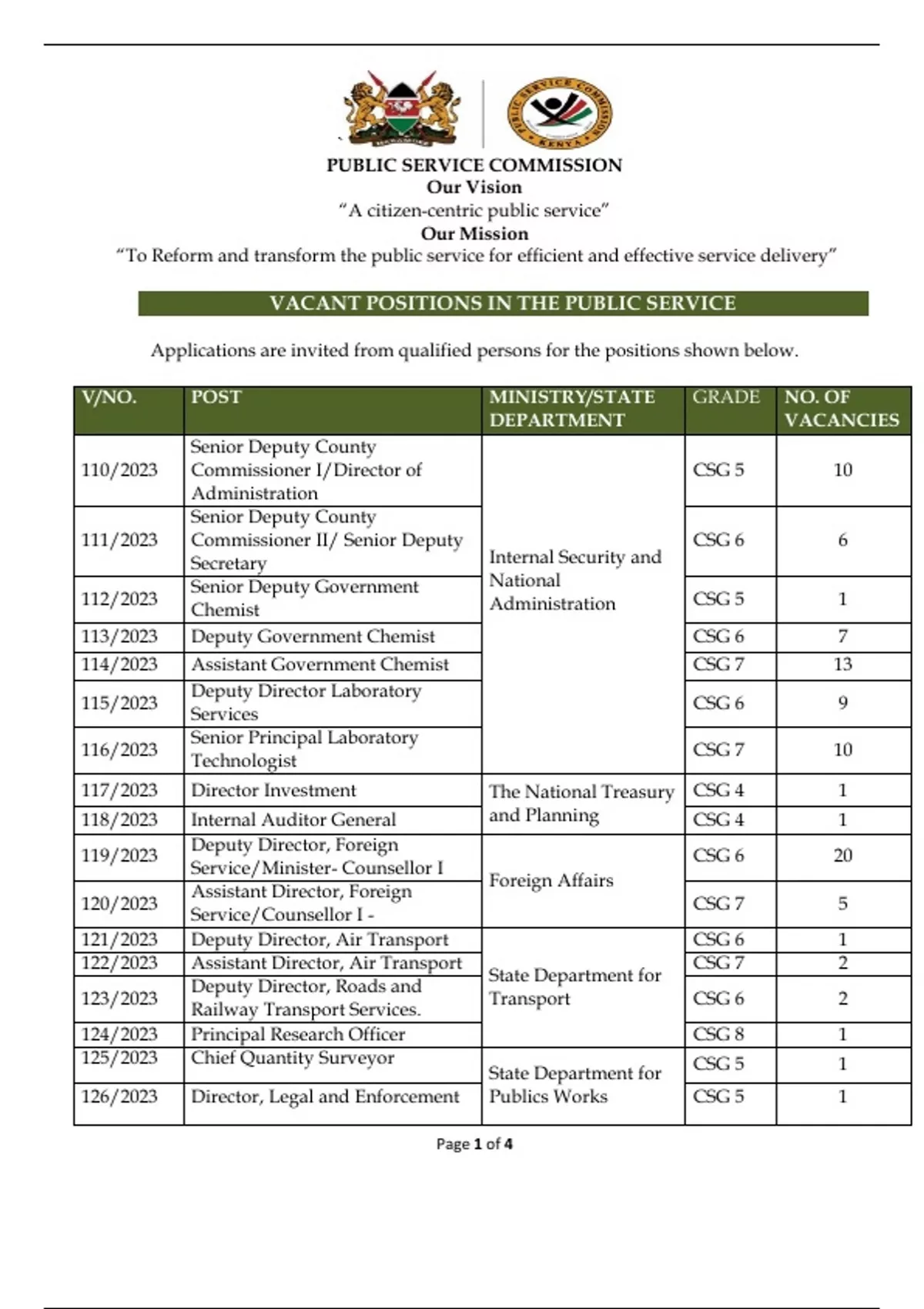 PUBLIC SERVICE COMMISSION Our Vision “A citizen-centric public service” Our Mission “To Reform and transform the public service for efficient and effective service delivery” VACANT POSITIONS IN THE PUBLIC SERVICE Applications are invited from qualified persons for the positions shown below. V/NO.POSTMINISTRY/STATE DEPARTMENT GRADE NO. OF VACANCIES 110/2023 Senior Deputy County Commissioner I/Director of Administration Internal Security and National Administration CSG 510 111/2023 Senior Deputy County Commissioner II/ Senior Deputy Secretary CSG 66 112/2023Senior Deputy Government Chemist CSG 51 113/2023Deputy Government ChemistCSG 6 7 114/2023Assistant Government Chemist CSG 7 13 115/2023Deputy Director Laboratory Services CSG 6 9 116/2023Senior Principal Laboratory Technologist CSG 7 10 117/2023Director Investment The National Treasury and Planning CSG 4 1 118/2023Internal Auditor General CSG 4 1 119/2023Deputy Director, Foreign Service/Minister-Counsellor IForeign Affairs CSG 620 120/2023Assistant Director, Foreign Service/Counsellor I - CSG 7 5 121/2023Deputy Director, Air Transport State Department for Transport CSG 61 122/2023Assistant Director, Air Transport CSG 7 2 123/2023Deputy Director, Roads and Railway Transport Services. CSG 6 2 124/2023Principal Research Officer CSG 81 125/2023Chief Quantity Surveyor State Department for Publics Works CSG 51 126/2023Director, Legal and EnforcementCSG 5 1 Page 1of 4