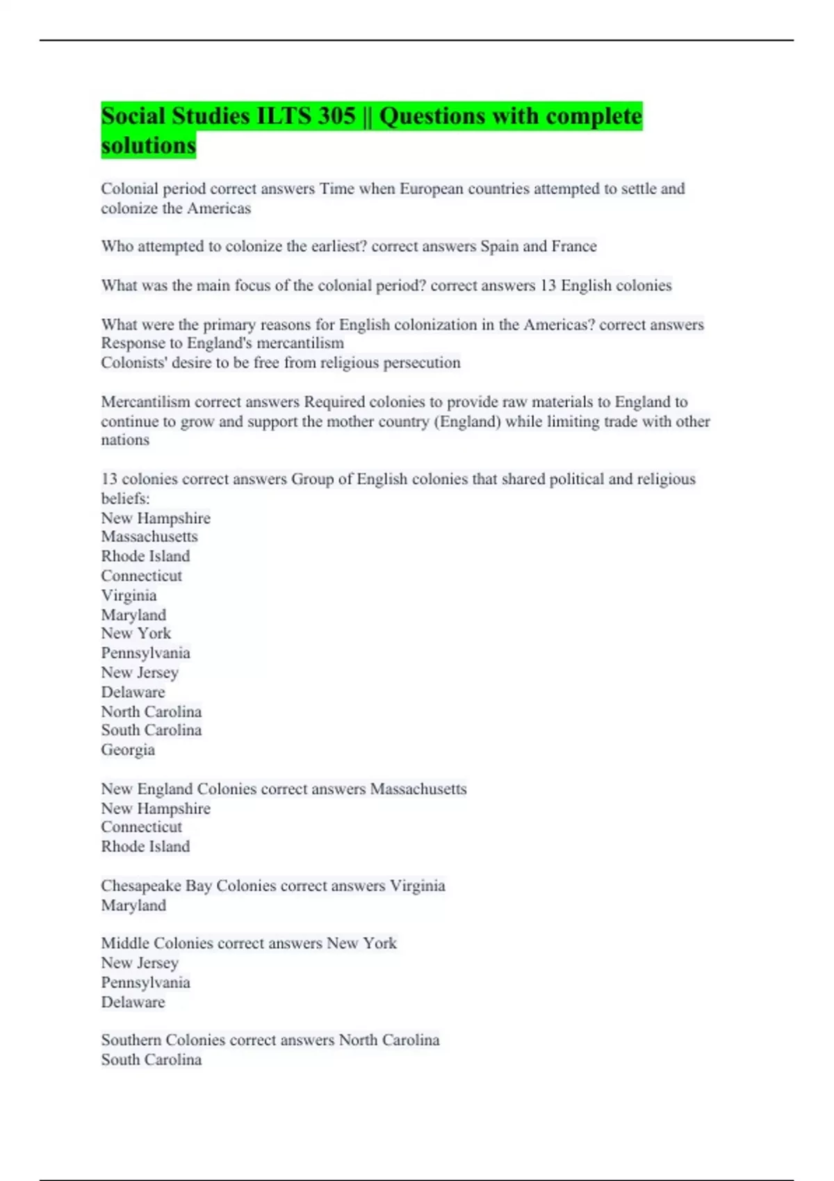 Colonial period correct answers Time when European countries attempted to settle and colonize the Americas Who attempted to colonize the earliest? correct answers Spain and France What was the main focus of the colonial period? correct answers 13 English colonies What were the primary reasons for English colonization in the Americas? correct answers Response to England's mercantilism Colonists' desire to be free from religious persecution Mercantilism correct answers Required colonies to provide raw materials to England to continue to grow and support the mother country (England) while limiting trade with other nations 13 colonies correct answers Group of English colonies that shared political and religious beliefs: New Hampshire Massachusetts Rhode Island Connecticut Virginia Maryland New York Pennsylvania New Jersey Delaware North Carolina South Carolina Georgia New England Colonies correct answers Massachusetts New Hampshire Connecticut Rhode Island Chesapeake Bay Colonies correct answers Virginia Maryland Middle Colonies correct answers New York New Jersey Pennsylvania Delaware Southern Colonies correct answers North Carolina South Carolina