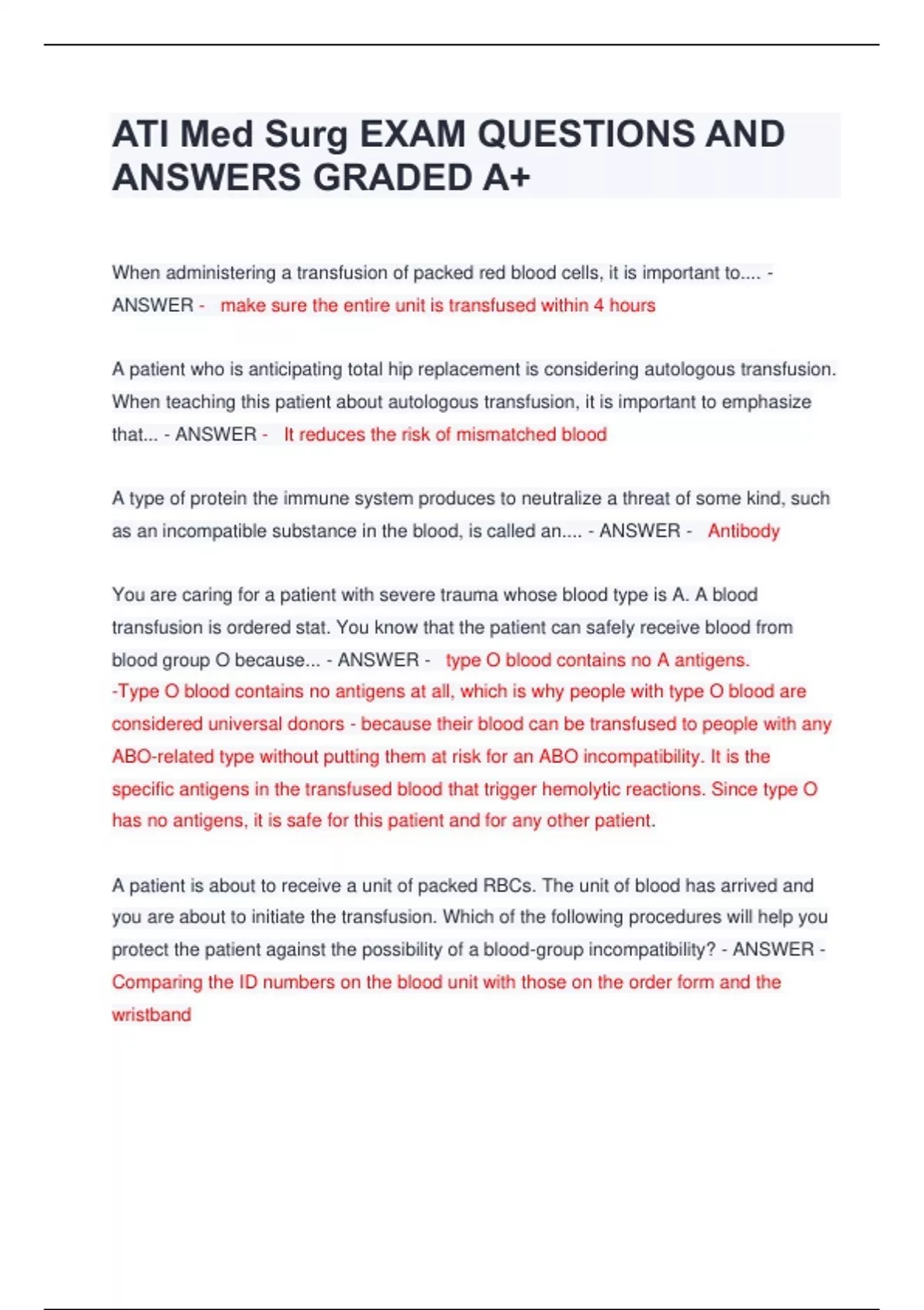ATI Med Surg EXAM QUESTIONS AND ANSWERS GRADED A+ When administering a transfusion of packed red blood cells, it is important to.... - ANSWER - make sure the entire unit is transfused within 4 hours A patient who is anticipating total hip replacement is considering autologous transfusion. When teaching this patient about autologous transfusion, it is important to emphasize that... - ANSWER - It reduces the risk of mismatched blood A type of protein the immune system produces to neutralize a threat of some kind, such as an incompatible substance in the blood, is called an.... - ANSWER - Antibody You are caring for a patient with severe trauma whose blood type is A. A blood transfusion is ordered stat. You know that the patient can safely receive blood from blood group O because... - ANSWER - type O blood contains no A antigens. -Type O blood contains no antigens at all, which is why people with type O blood are considered universal donors - because their blood can be transfused to people with any ABO-related type without putting them at risk for an ABO incompatibility. It is the specific antigens in the transfused blood that trigger hemolytic reactions. Since type O has no antigens, it is safe for this patient and for any other patient. A patient is about to receive a unit of packed RBCs. The unit of blood has arrived and you are about to initiate the transfusion. Which of the following procedures will help you protect the patient against the possibility of a blood-group incompatibility? - ANSWER - Comparing the ID numbers on the blood unit with those on the order form and the wristband Prior to administering a blood transfusion, it is essential to explain to the patient that.... - ANSWER - he must immediately report any subjective symptoms like chills, nausea, or itching A patient about to receive a unit of packed RBCs states, "this is my third unit of blood today. I don't want to get some disease from all this blood." Which of the following would be your best response? - ANSWER - "Donated blood is carefully screened for infectious diseases." Which is an essential nursing action prior to starting a blood transfusion? - ANSWER - ensure informed consent has been obtained A platelet transfusion is indicated for a patient who - ANSWER - Has thrombocytopenia You started a transfusion of packed RBCs about *1 hour ago*. Your patient has suddenly developed shaking chills, muscle stiffness, and a temp of 101.4F. He appears flushed and reports a headache and nervousness. Your patient has most likely developed which type of transfusion reaction? - ANSWER - Febrile nonhemolytic A patient who sustained trauma from a motor-vehicle crash is transported to an emergency department. The provider determines the need for immediate central venous access for fluid and blood replacement and prophylactic abx therapy. The appropriate central venous access device for this patient is.... - ANSWER - A nontunneled percutaneous central catheter -this type of central catheter is ideal for emergency situations where short term central venous access is required for multiple therapies A nurse is caring for a patient who has a central venous catheter. When flushing the catheter, the nurse uses a 10mL syringe to prevent which of the following complications