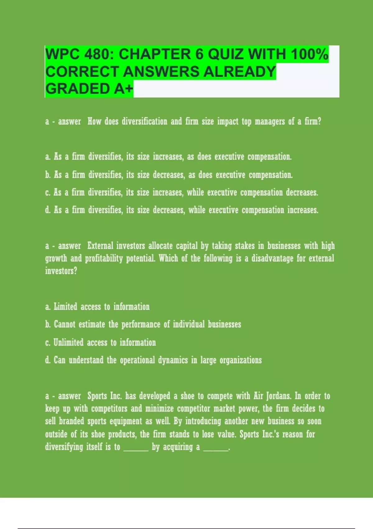a How does diversification and firm size impact top managers of a firm? a. As a firm diversifies, its size increases, as does executive compensation. b. As a firm diversifies, its size decreases, as does executive compensation. c. As a firm diversifies, its size increases, while executive compensation decreases. d. As a firm diversifies, its size decreases, while executive compensation increases. a External investors allocate capital by taking stakes in businesses with high growth and profitability potential. Which of the following is a disadvantage for external investors? a. Limited access to information b. Cannot estimate the performance of individual businesses c. Unlimited access to information d. Can understand the operational dynamics in large organizations a Sports Inc. has developed a shoe to compete with Air Jordans. In order to keep up with competitors and minimize competitor market power, the firm decides to sell branded sports equipment as well. By introducing another new business so soon outside of its shoe products, the firm stands to lose value. Sports Inc.'s reason for diversifying itself is to _____ by acquiring a _____. a. neutralize another firm's advantage; similar distribution outlet b. decrease another firm's advantage; similar distribution outlet c. increase its value; similar distribution outlet as a competitor d. decrease another firm's value; different distribution outlet a Typically, a diversification strategy is used to _____ the firm's value by _____ its overall performance. a. increase; improving b. maintain; improving c. decrease; improving d. increase; decreasing a Which of the following is a reason(s) that keeps managers from selfishly diversifying the firm for higher compensation? a. Concerns for their reputation and strong managerial talent market b. Concerns for their reputation and weak managerial talent market c. Fear that the firm would lose value d. To avoid the responsibility of a more highly complex firm d A popular TV network, QTV, wishes to gain a competitive advantage by managing several businesses from its corporate headquarters. Among its goals, QTV hopes to acquire its competitor, RTV, in the process. In this instance, QTV is using which type of strategy? a. Business-level strategy b. Network-level strategy c. Global-level strategy d. Corporate-level strategy b Turtlecreek owns a high-end grocery chain, a high-end outdoor gear chain, and a sporting goods chain. Its retail businesses are unrelated; however, the firm hopes to gain an advantage over its competitors by associating its perceived luxury brand with each business. By selecting and managing these various businesses, Turtlecreek is implementing a _____ strategy. a. business-level b. corporate-level c. firm-level d. small-business b What are the two ways an unrelated diversification strategy can create value through financial economies? a. Efficient external capital allocations and the restructuring of acquired allocations b. Efficient internal capital allocations and the restructuring of acquired assets c. Efficient external capital allocations and the restructuring of acquired assets d. Inefficient internal capital allocations and the restructuring of acquired assets d Which of the following would be a motive for top-level executives to diversify their firm beyond value-creating and value-neutral levels? a. Decreased compensation and reduction of managerial risk b. Pursuit of a managerial challenge c. Interest in a promotion to a board position d. Increased compensation and reduced managerial risk b A secondhand computer retailer is often mistaken for an IT-help business. As a result, tech-savvy employees of the retailer are often fixing the customers' computer issues when they come into the store. The firm that owns the secondhand computer retailer has decided to diversify and open computer repair shops selling IT services. The retailer is diversifying on the basis of employee knowledge, which is considered a(n) _____ resource. a. tangible b. intangible c. nonsubstitutable d. rare