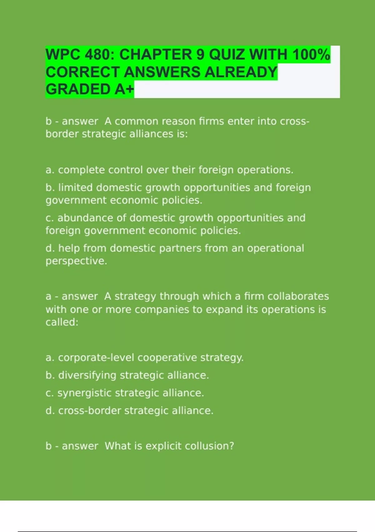 b A common reason firms enter into cross-border strategic alliances is: a. complete control over their foreign operations. b. limited domestic growth opportunities and foreign government economic policies. c. abundance of domestic growth opportunities and foreign government economic policies. d. help from domestic partners from an operational perspective. a A strategy through which a firm collaborates with one or more companies to expand its operations is called: a. corporate-level cooperative strategy. b. diversifying strategic alliance. c. synergistic strategic alliance. d. cross-border strategic alliance. b What is explicit collusion? a. A form of competition-reducing strategy in which several firms indirectly coordinate their production and pricing decisions by observing each other's actions and responses b. A form of competition-reducing strategy in which two or more firms negotiate directly to determine the amount to produce and the prices for the product c. A form of competition-reducing strategy in which firms do not take competitive actions against rivals d. A form of competition-reducing strategy in which firms share some of their resources from different stages of the value chain to create competitive advantage a Because the resources and relationships among partners is complex, most R&D strategic alliances are what type? a. Equity b. Nonequity c. Cross-border d. Joint venture c A car manufacturer and its partner in a cooperative strategic alliance have very minimal contract terms. Both firms are hoping to learn from each other to develop new, value-creating, innovative products. By implementing very few contractual terms in their alliance, the two firms are managing their cooperative strategy using which approach? a. Cost maximization b. Cost minimization c. Opportunity maximization d. Opportunity minimization a The main objective of the collaborating firms in a cooperative strategy is to: a. increase competitive advantage. b. neutralize each other's competitive advantage. c. decrease the other's competitive advantage. d. decrease both partners' competitive advantage. b A tech startup is exploring ways to develop an app that allows patients to visit their doctors virtually. The startup is partnering with a local practice to compile data, including symptoms, common ailments, and clinical expertise, to be accessible through the interface of the app. The company anticipates the project will take two to three years. What type of business-level strategy best fits this partnership? a. Competition-reducing strategy b. Vertical complementary strategic alliance c. Uncertainty-reducing strategy d. Competition response strategy b When a company in a cooperative strategy is implementing mechanisms to ensure that its partner does not use its trade secrets to benefit outside the relationship alone, a firm is practicing which cooperative strategy management practice? a. Cost maximization b. Cost minimization c. Opportunistic minimization d. Opportunity maximization a In order to remain relevant, firms must explore opportunities to maintain or increase their competitive advantage at all times. In doing so, some opportunities may be out of reach of the firm's normal capabilities. By entering into strategic alliances, how can a firm achieve competitive advantage? a. Partnering with another firm in a strategic alliance and trading valuable resources enables both firms to further develop their products or markets to gain competitive advantage. b. Both firms can achieve competitive advantage over one another, even if they are operating in the same product market, by using each other's most valuable resources. c. Both firms can behave opportunistically towards one another to keep the other from gaining competitive advantage. d. One firm can gain competitive advantage by taking advantage of its partner's resources and giving its partner less valuable resources. a How is an opportunity maximization approach a more effective alternative to the cost minimization approach of managing cooperative strategy? a. Opportunity maximization comes with a high level of trust between partners, which leads to an increased likelihood of success. b. Opportunity maximization enables firms to decrease their cost structure, which leads to an increased likelihood of success. c. Opportunity maximization leads to more definite contractual obligations for each partner, which leads to an increased likelihood of success. d. Opportunity maximization allows firms to take advantage of each other's resources without limitations imposed by one another.