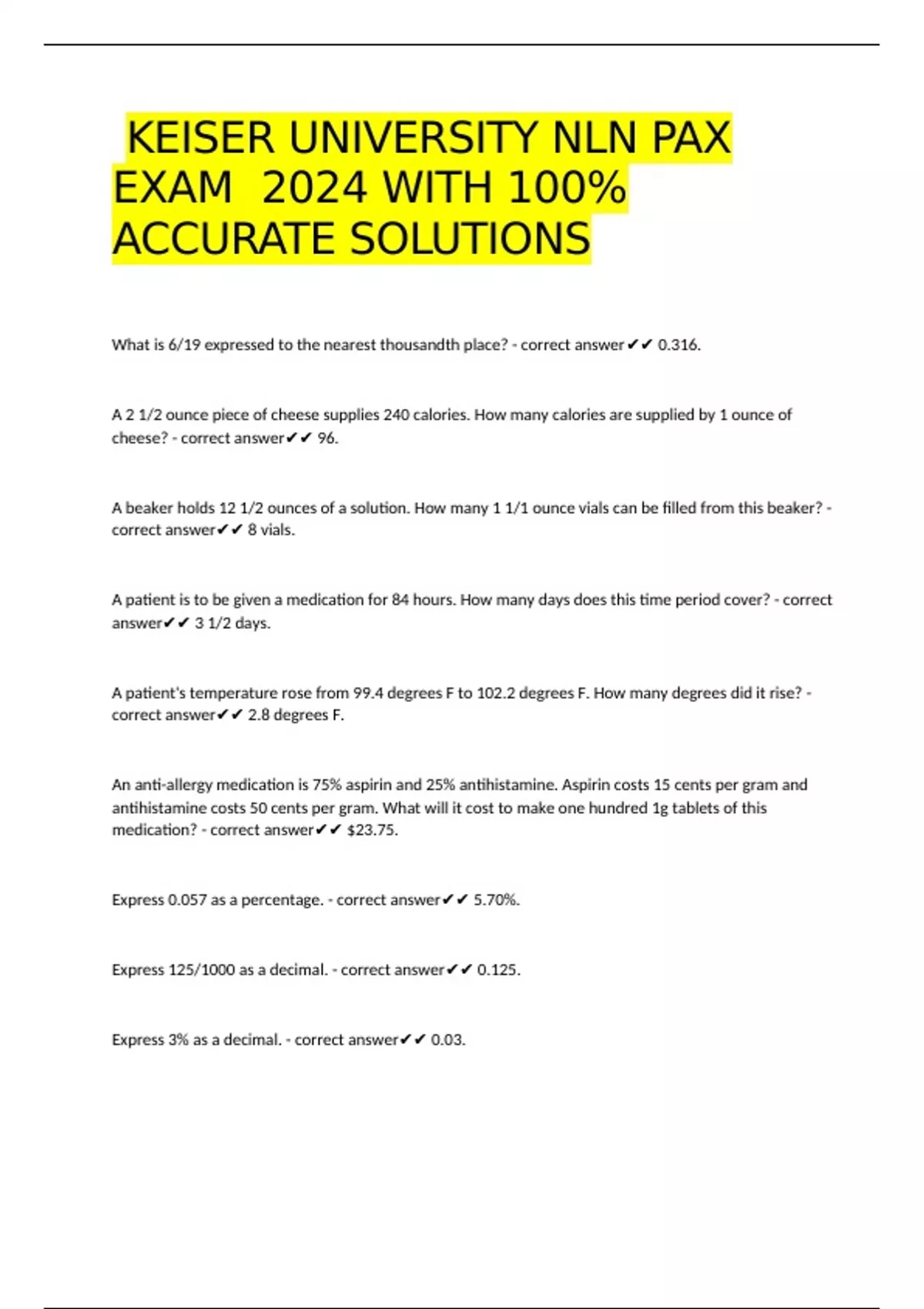 KEISER UNIVERSITY NLN PAX EXAM 2024 WITH 100% ACCURATE SOLUTIONS What is 6/19 expressed to the nearest thousandth place? - correct answer 0.316. A 2 1/2 ounce piece of cheese supplies 240 calories. How many calories are supplied by 1 ounce of cheese? - correct answer 96. A beaker holds 12 1/2 ounces of a solution. How many 1 1/1 ounce vials can be filled from this beaker? - correct answer 8 vials. A patient is to be given a medication for 84 hours. How many days does this time period cover? - correct answer 3 1/2 days. A patient's temperature rose from 99.4 degrees F to 102.2 degrees F. How many degrees did it rise? - correct answer 2.8 degrees F. An anti-allergy medication is 75% aspirin and 25% antihistamine. Aspirin costs 15 cents per gram and antihistamine costs 50 cents per gram. What will it cost to make one hundred 1g tablets of this medication? - correct answer $23.75. Express 0.057 as a percentage. - correct answer 5.70%. Express 125/1000 as a decimal. - correct answer 0.125. Express 3% as a decimal. - correct answer 0.03.