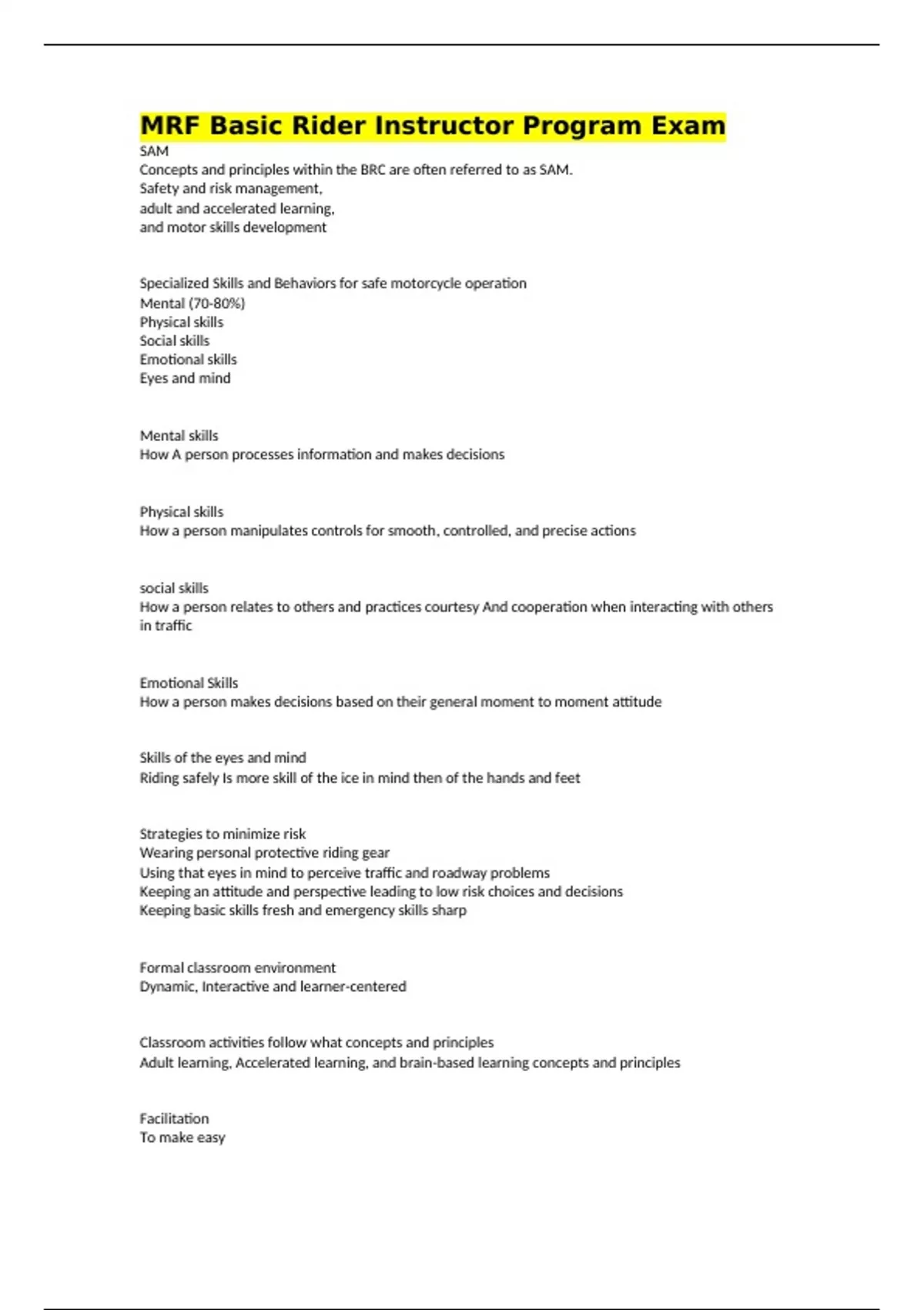 MRF Basic Rider Instructor Program Exam SAM Concepts and principles within the BRC are often referred to as SAM. Safety and risk management, adult and accelerated learning, and motor skills development Specialized Skills and Behaviors for safe motorcycle operation Mental (70-80%) Physical skills Social skills Emotional skills Eyes and mind Mental skills How A person processes information and makes decisions Physical skills How a person manipulates controls for smooth, controlled, and precise actions social skills How a person relates to others and practices courtesy And cooperation when interacting with others in traffic Emotional Skills How a person makes decisions based on their general moment to moment attitude Skills of the eyes and mind Riding safely Is more skill of the ice in mind then of the hands and feet Strategies to minimize risk Wearing personal protective riding gear Using that eyes in mind to perceive traffic and roadway problems Keeping an attitude and perspective leading to low risk choices and decisions Keeping basic skills fresh and emergency skills sharp Formal classroom environment Dynamic, Interactive and learner-centered Classroom activities follow what concepts and principles Adult learning, Accelerated learning, and brain-based learning concepts and principles Facilitation To make easy
