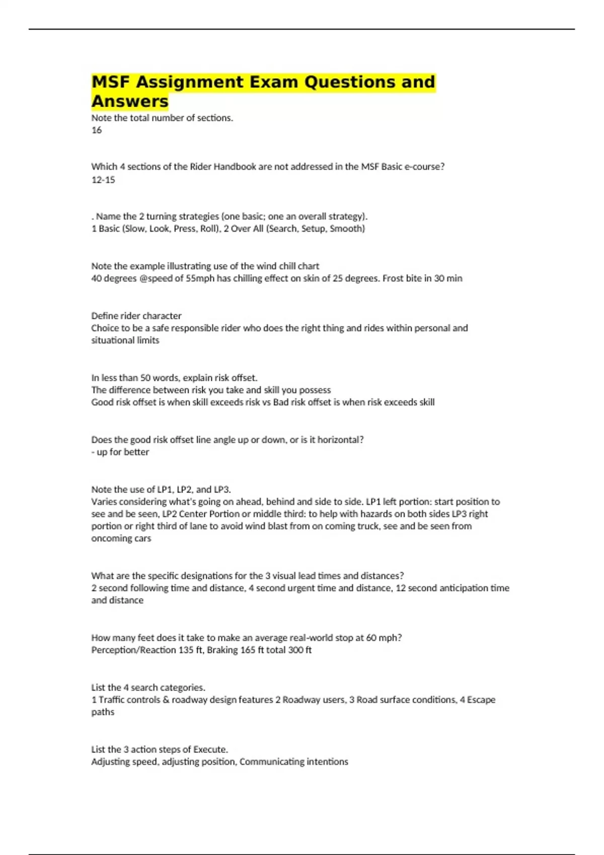 MSF Assignment Exam Questions and Answers Note the total number of sections. 16 Which 4 sections of the Rider Handbook are not addressed in the MSF Basic e-course? 12-15 . Name the 2 turning strategies (one basic; one an overall strategy). 1 Basic (Slow, Look, Press, Roll), 2 Over All (Search, Setup, Smooth) Note the example illustrating use of the wind chill chart 40 degrees @speed of 55mph has chilling effect on skin of 25 degrees. Frost bite in 30 min Define rider character Choice to be a safe responsible rider who does the right thing and rides within personal and situational limits In less than 50 words, explain risk offset. The difference between risk you take and skill you possess Good risk offset is when skill exceeds risk vs Bad risk offset is when risk exceeds skill Does the good risk offset line angle up or down, or is it horizontal? - up for better Note the use of LP1, LP2, and LP3. Varies considering what's going on ahead, behind and side to side. LP1 left portion: start position to see and be seen, LP2 Center Portion or middle third: to help with hazards on both sides LP3 right portion or right third of lane to avoid wind blast from on coming truck, see and be seen from oncoming cars What are the specific designations for the 3 visual lead times and distances? 2 second following time and distance, 4 second urgent time and distance, 12 second anticipation time and distance How many feet does it take to make an average real‐world stop at 60 mph? Perception/Reaction 135 ft, Braking 165 ft total 300 ft List the 4 search categories. 1 Traffic controls & roadway design features 2 Roadway users, 3 Road surface conditions, 4 Escape paths List the 3 action steps of Execute. Adjusting speed, adjusting position, Communicating intentions