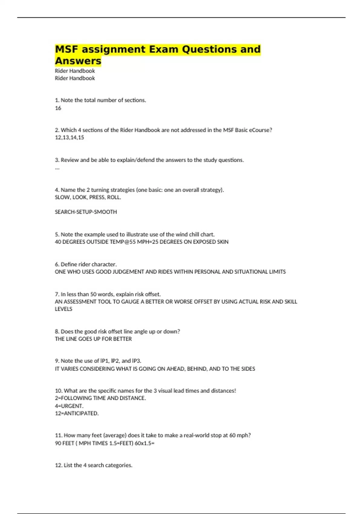 MSF assignment Exam Questions and Answers Rider Handbook Rider Handbook 1. Note the total number of sections. 16 2. Which 4 sections of the Rider Handbook are not addressed in the MSF Basic eCourse? 12,13,14,15 3. Review and be able to explain/defend the answers to the study questions. ... 4. Name the 2 turning strategies (one basic: one an overall strategy). SLOW, LOOK, PRESS, ROLL. SEARCH-SETUP-SMOOTH 5. Note the example used to illustrate use of the wind chill chart. 40 DEGREES OUTSIDE TEMP@55 MPH=25 DEGREES ON EXPOSED SKIN 6. Define rider character. ONE WHO USES GOOD JUDGEMENT AND RIDES WITHIN PERSONAL AND SITUATIONAL LIMITS 7. In less than 50 words, explain risk offset. AN ASSESSMENT TOOL TO GAUGE A BETTER OR WORSE OFFSET BY USING ACTUAL RISK AND SKILL LEVELS 8. Does the good risk offset line angle up or down? THE LINE GOES UP FOR BETTER 9. Note the use of lP1, lP2, and lP3. IT VARIES CONSIDERING WHAT IS GOING ON AHEAD, BEHIND, AND TO THE SIDES 10. What are the specific names for the 3 visual lead times and distances! 2=FOLLOWING TIME AND DISTANCE. 4=URGENT. 12=ANTICIPATED. 11. How many feet (average) does it take to make a real-world stop at 60 mph? 90 FEET ( MPH TIMES 1.5=FEET) 60x1.5= 12. List the 4 search categories.