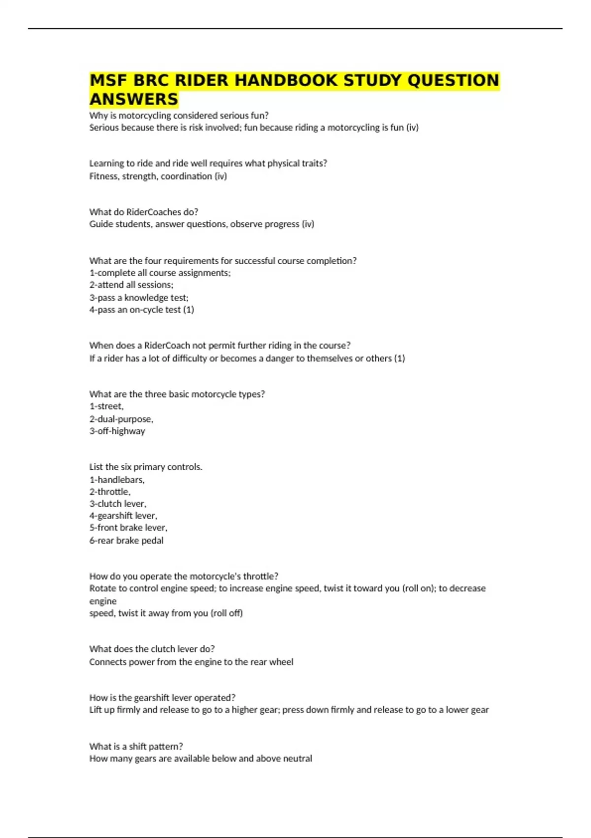 MSF BRC RIDER HANDBOOK STUDY QUESTION ANSWERS Why is motorcycling considered serious fun? Serious because there is risk involved; fun because riding a motorcycling is fun (iv) Learning to ride and ride well requires what physical traits? Fitness, strength, coordination (iv) What do RiderCoaches do? Guide students, answer questions, observe progress (iv) What are the four requirements for successful course completion? 1-complete all course assignments; 2-attend all sessions; 3-pass a knowledge test; 4-pass an on-cycle test (1) When does a RiderCoach not permit further riding in the course? If a rider has a lot of difficulty or becomes a danger to themselves or others (1) What are the three basic motorcycle types? 1-street, 2-dual-purpose, 3-off-highway List the six primary controls. 1-handlebars, 2-throttle, 3-clutch lever, 4-gearshift lever, 5-front brake lever, 6-rear brake pedal How do you operate the motorcycle's throttle? Rotate to control engine speed; to increase engine speed, twist it toward you (roll on); to decrease engine speed, twist it away from you (roll off) What does the clutch lever do? Connects power from the engine to the rear wheel How is the gearshift lever operated? Lift up firmly and release to go to a higher gear; press down firmly and release to go to a lower gear What is a shift pattern?