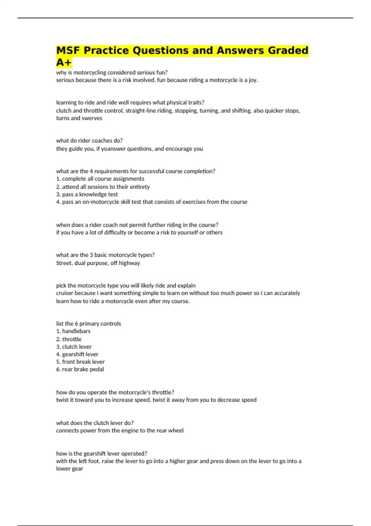 MSF Practice Questions and Answers Graded A+ why is motorcycling considered serious fun? serious because there is a risk involved. fun because riding a motorcycle is a joy. learning to ride and ride well requires what physical traits? clutch and throttle control, straight-line riding, stopping, turning, and shifting. also quicker stops, turns and swerves what do rider coaches do? they guide you, if yoanswer questions, and encourage you what are the 4 requirements for successful course completion? 1. complete all course assignments 2. attend all sessions to their entirety 3. pass a knowledge test 4. pass an on-motorcycle skill test that consists of exercises from the course when does a rider coach not permit further riding in the course? if you have a lot of difficulty or become a risk to yourself or others what are the 3 basic motorcycle types? Street, dual purpose, off highway pick the motorcycle type you will likely ride and explain cruiser because I want something simple to learn on without too much power so I can accurately learn how to ride a motorcycle even after my course. list the 6 primary controls 1. handlebars 2. throttle 3. clutch lever 4. gearshift lever 5. front break lever 6. rear brake pedal how do you operate the motorcycle's throttle? twist it toward you to increase speed. twist it away from you to decrease speed what does the clutch lever do? connects power from the engine to the rear wheel how is the gearshift lever operated? with the left foot. raise the lever to go into a higher gear and press down on the lever to go into a lower gear