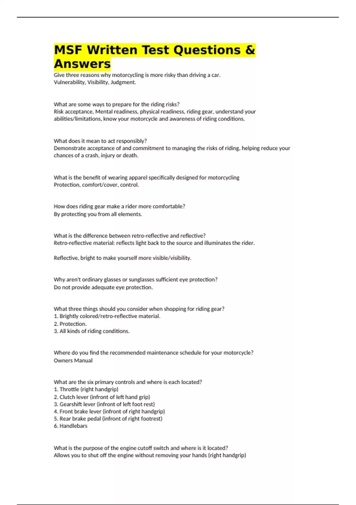 MSF Written Test Questions & Answers Give three reasons why motorcycling is more risky than driving a car. Vulnerability, Visibility, Judgment. What are some ways to prepare for the riding risks? Risk acceptance, Mental readiness, physical readiness, riding gear, understand your abilities/limitations, know your motorcycle and awareness of riding conditions. What does it mean to act responsibly? Demonstrate acceptance of and commitment to managing the risks of riding, helping reduce your chances of a crash, injury or death. What is the benefit of wearing apparel specifically designed for motorcycling Protection, comfort/cover, control. How does riding gear make a rider more comfortable? By protecting you from all elements. What is the difference between retro-reflective and reflective? Retro-reflective material: reflects light back to the source and illuminates the rider. Reflective, bright to make yourself more visible/visibility. Why aren't ordinary glasses or sunglasses sufficient eye protection? Do not provide adequate eye protection. What three things should you consider when shopping for riding gear? 1. Brightly colored/retro-reflective material. 2. Protection. 3. All kinds of riding conditions. Where do you find the recommended maintenance schedule for your motorcycle? Owners Manual What are the six primary controls and where is each located? 1. Throttle (right handgrip) 2. Clutch lever (infront of left hand grip) 3. Gearshift lever (infront of left foot rest) 4. Front brake lever (infront of right handgrip) 5. Rear brake pedal (infront of right footrest) 6. Handlebars What is the purpose of the engine cutoff switch and where is it located? Allows you to shut off the engine without removing your hands (right handgrip)