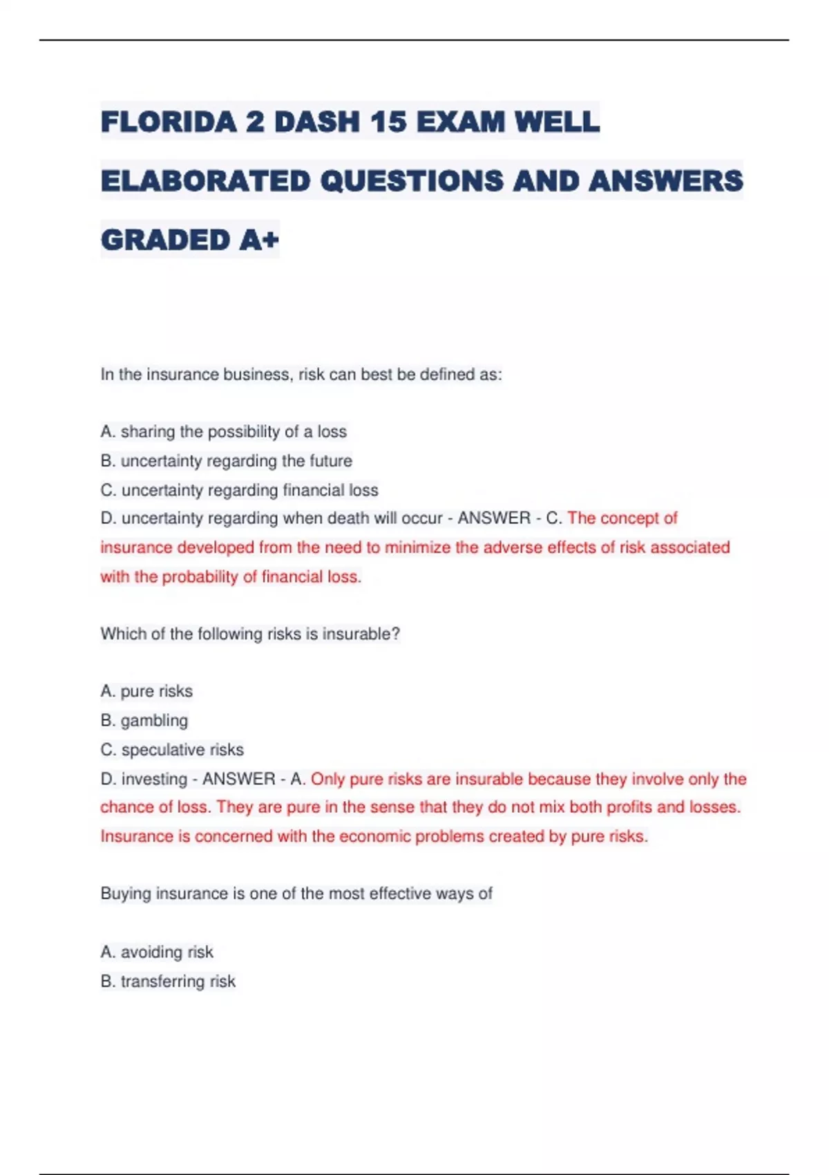 FLORIDA 2 DASH 15 EXAM WELL ELABORATED QUESTIONS AND ANSWERS GRADED A+ In the insurance business, risk can best be defined as: A. sharing the possibility of a loss B. uncertainty regarding the future C. uncertainty regarding financial loss D. uncertainty regarding when death will occur - ANSWER - C. The concept of insurance developed from the need to minimize the adverse effects of risk associated with the probability of financial loss. Which of the following risks is insurable? A. pure risks B. gambling C. speculative risks D. investing - ANSWER - A. Only pure risks are insurable because they involve only the chance of loss. They are pure in the sense that they do not mix both profits and losses. Insurance is concerned with the economic problems created by pure risks. Buying insurance is one of the most effective ways of A. avoiding risk B. transferring risk C. reducing risk D. retaining risk - ANSWER - B. Buying insurance is one of the most effective ways of transferring risk. Through the insurance contract, the burden of carrying the risk and indemnifying the financial loss is transferred from the individual to the insurance company. Which of the following best describes the function of insurance? A. it is a form of legalized gambling. B. it spreads financial risk over a large group to minimize the loss to any one individual C. it protects against living too long D. it creates and protects risks - ANSWER - B. The function of insurance is to safeguard against financial loss by having the losses of few paid by the contributions of many who are exposed to the same risk. All of the following are elements of an insurable risk EXCEPT A. the loss must be due to chance B. the loss must be predictable C. the loss must be catastrophic D. the loss must have a determinable value - ANSWER - C. One of the criteria for an insurable risk is that it NOT be catastrophic. A principle of insurance holds that only a small portion of a given group will experience loss at any one time. Risks that would adversely affect large numbers of people or large amounts of property - wars or floods, for example - are typically not insurable. The amount of money an insurer sets aside to pay future claims is called A. a premium B. a reserve C. a dividend D. an accumulated interest - ANSWER - B. Reserves can be defined as the amounts that are set aside to fulfill the insurance company's obligation to pay future claims. The reserve is compiled from past premium payments and interest. Which of the following constitutes an insurable interest? A. the policyowner must expect to benefit from the insured's death B. the policyowner must expect to suffer a loss when the insured dies or becomes disabled C. the beneficiary, by definition, has an insurable interest in the insured D. the insured must have a personal or business relationship with the beneficiary - ANSWER - B. Insurable interest requires the policyowner to benefit from the insured's continuing to live or enjoy good health or to suffer a loss when the insured dies or is disabled. Which of the following statements describes the parol evidence rule? A. a written contract cannot be changed once it is signed B. an oral contract cannot be modified by written evidence C. a written contract cannot be changed by oral evidence D. an oral contract takes precedence over any earlier written contract - ANSWER - C. The parol evidence rule states that when parties put their agreement in writing, all previous verbal statements come together in that writing, and a written contract cannot be changed or modified by parol (oral) evidence. Which of the following factors determines whether policy dividends will be paid on a participating policy? A. reserves and experience B. expenses and claims costs C. interest and benefits