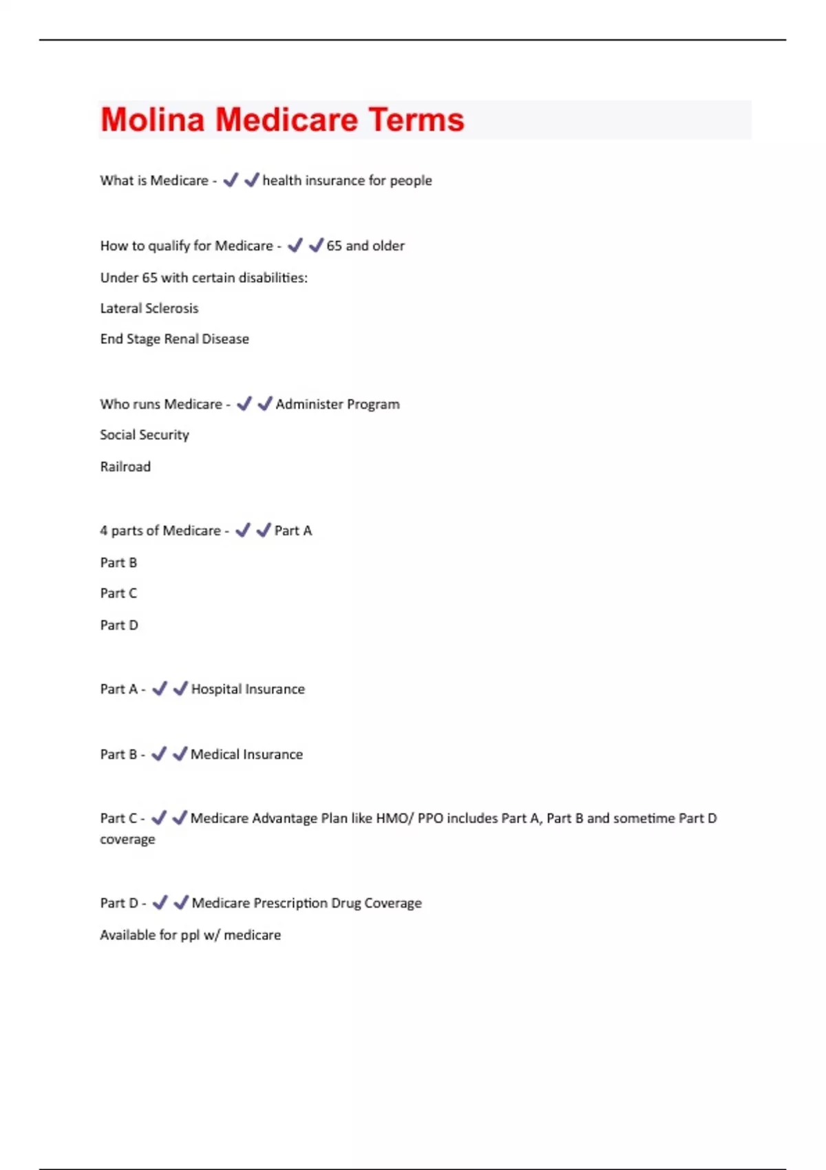 What is Medicare - health insurance for people How to qualify for Medicare - 65 and older Under 65 with certain disabilities: Lateral Sclerosis End Stage Renal Disease Who runs Medicare - Administer Program Social Security Railroad 4 parts of Medicare - Part A Part B Part C Part D Part A - Hospital Insurance Part B - Medical Insurance Part C - Medicare Advantage Plan like HMO/ PPO includes Part A, Part B and sometime Part D coverage Part D - Medicare Prescription Drug Coverage Available for ppl w/ medicareMedicare Coverage Choices - Original Medicare & Medicare Advantage Plan Original Medicare - Part A and Part B can add on Medigap, Part D prescription Medicare Advantage Plan - Part C that combines Part A&B may include or be able to add Part D Special Enrollment Period (SEP) - Most people don't qualify for SEP Must have a group health plan coverage based on active, current employment of you or your spouse Benefit Period - measures for SNF Services begin the day you first receive inpatient care ends when not in hospital/SNF 60 days in a row pay part A deductible for each benefit period Medi-gap - Medicare Supplement Insurance sold by private insurance Fills gaps in Original Medicare deductibles, co-insurance, copayments All plans with same letter Enrolling in Medicare when it Not Automatic - you need to enroll with Social Security or visit your local office When to enroll in Medicare - 7 months begins 3 months before 65 birthday includes month of birthday 3 months after birthdayGeneral enrollment period - For people who didn't sign up for Part B or Premium Part A Original Medicare Part A Hospital Insurance Coverage - -Inpatient hospital care -Inpatient skilled nursing facility (SNF) care -Blood(inpatient) -Inpatient non- religious non medical health care institutions -Home Health Care -Hospice Care Cost For SNF - $0 for the first 20 days of each benefit period $157.50 per day for 21-100 of each benefit period all cost for each day after day 100 in a benefit period Medicare Part B Coverage - doctor services outpatient medical and surgical services supplies clinical lab test Part B Yearly Deductible - What you pay in Original Medicare 147.00