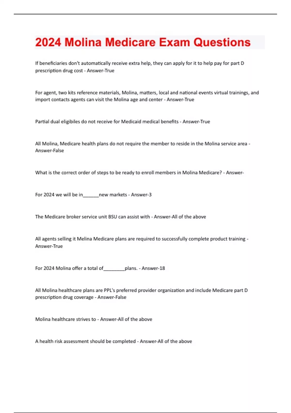 f beneficiaries don't automatically receive extra help, they can apply for it to help pay for part D prescription drug cost - Answer-True For agent, two kits reference materials, Molina, matters, local and national events virtual trainings, and import contacts agents can visit the Molina age and center - Answer-True Partial dual eligibiles do not receive for Medicaid medical benefits - Answer-True All Molina, Medicare health plans do not require the member to reside in the Molina service area - Answer-False What is the correct order of steps to be ready to enroll members in Molina Medicare? - AnswerFor 2024 we will be in______new markets - Answer-3 The Medicare broker service unit BSU can assist with - Answer-All of the above All agents selling it Melina Medicare plans are required to successfully complete product training - Answer-True For 2024 Molina offer a total of________plans. - Answer-18 All Molina healthcare plans are PPL's preferred provider organization and include Medicare part D prescription drug coverage - Answer-False Molina healthcare strives to - Answer-All of the above A health risk assessment should be completed - Answer-All of the above