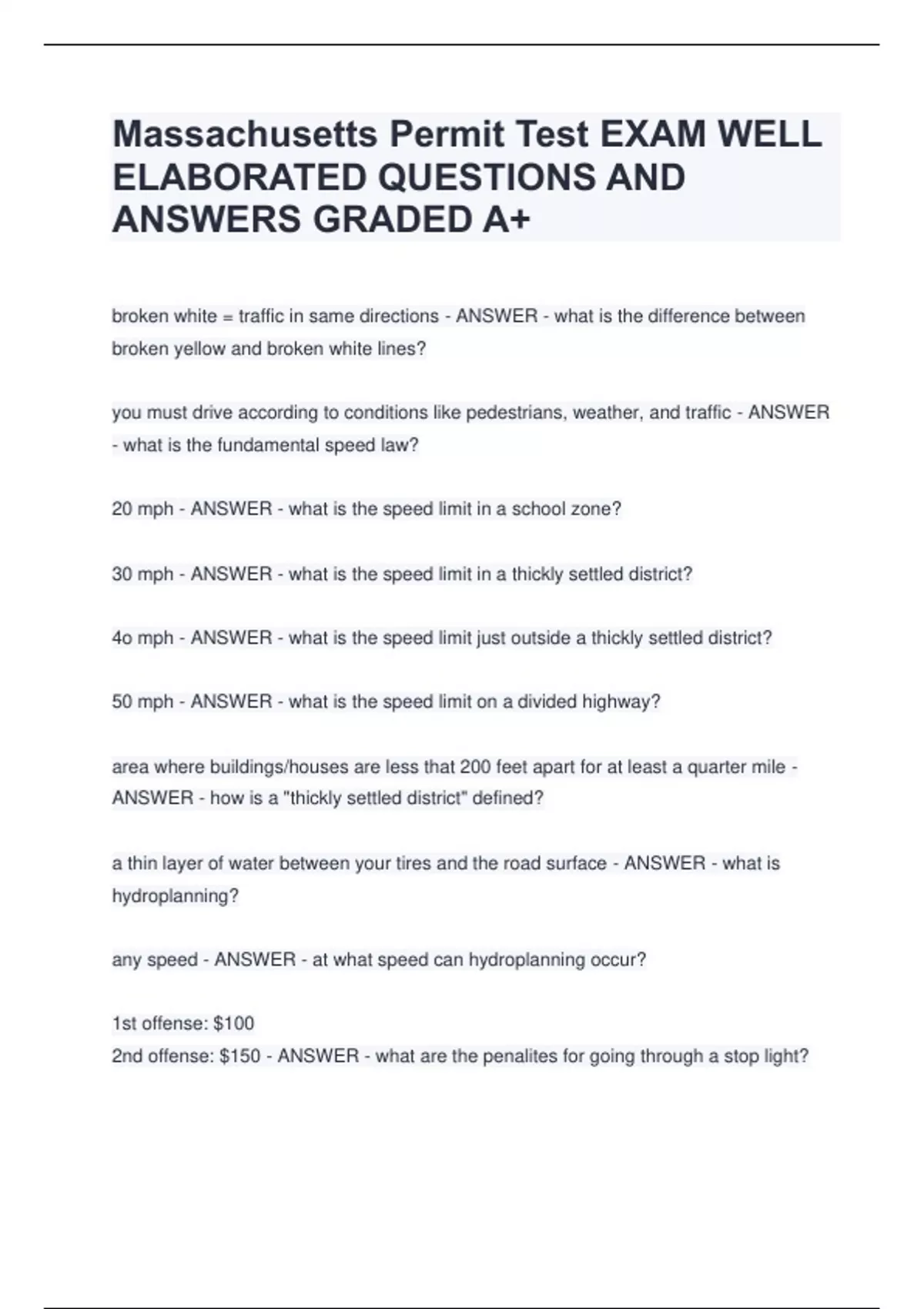 Massachusetts Permit Test EXAM WELL ELABORATED QUESTIONS AND ANSWERS GRADED A+ broken white = traffic in same directions - ANSWER - what is the difference between broken yellow and broken white lines? you must drive according to conditions like pedestrians, weather, and traffic - ANSWER - what is the fundamental speed law? 20 mph - ANSWER - what is the speed limit in a school zone? 30 mph - ANSWER - what is the speed limit in a thickly settled district? 4o mph - ANSWER - what is the speed limit just outside a thickly settled district? 50 mph - ANSWER - what is the speed limit on a divided highway? area where buildings/houses are less that 200 feet apart for at least a quarter mile - ANSWER - how is a "thickly settled district" defined? a thin layer of water between your tires and the road surface - ANSWER - what is hydroplanning? any speed - ANSWER - at what speed can hydroplanning occur? 1st offense: $100 2nd offense: $150 - ANSWER - what are the penalites for going through a stop light? person who arrived first or the person on the right - ANSWER - who has the right of way at a four way stop sign? 1 foot - ANSWER - what is the legal distance for parking from a curb? 8 feet - ANSWER - what is the legal distance for parking from a trolley? 10 feet - ANSWER - what is the legal distance for parking from a fire hydrant? 20 feet - ANSWER - what is the legal distance for parking from an intersection? 50 feet - ANSWER - what is the legal distance for driving in reverse? 60 feet - ANSWER - what is the legal distance your license must be visable? 100 feet - ANSWER - what is the distance to signal before a turn? 300 feet - ANSWER - what is the distance when following an emergency vehicle? class d - ANSWER - which class is the license? 5 years - ANSWER - how long is your license valid for? passenger vehicles, vans, small trucks - ANSWER - what vehicles does a class D license allow you to operate? left turn - ANSWER - what does this hand signal indicate? right turn - ANSWER - what does this hand signal indicate? stop/slow down - ANSWER - what does this hand signal indicate?