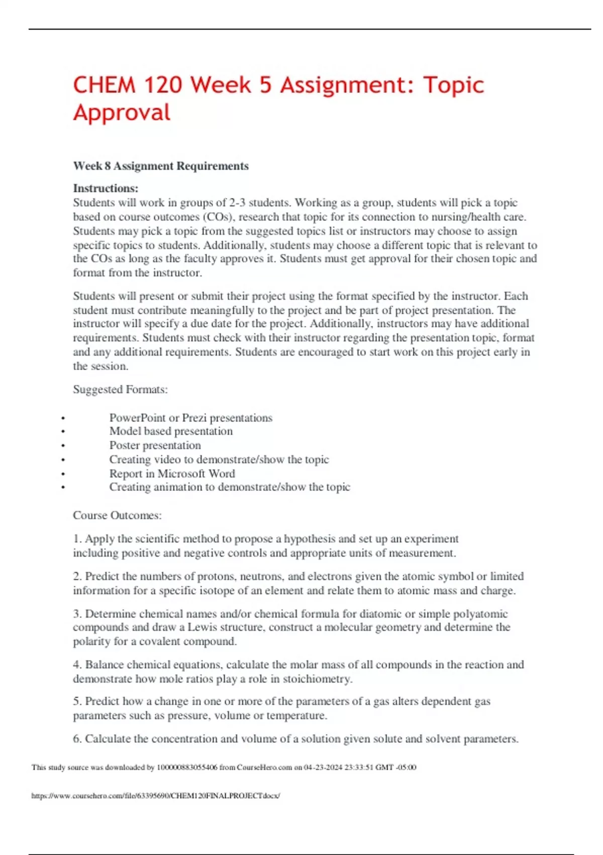 CHEM 120 Week 5 Assignment: Topic Approval - Download For An A+