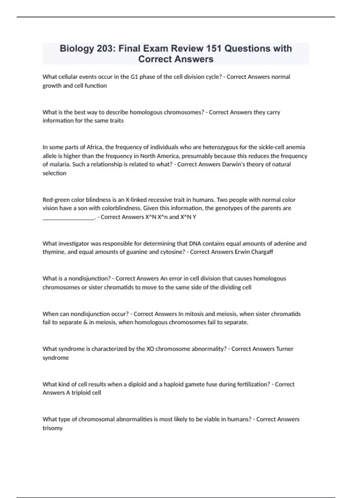 Biology 203: Final Exam Review 151 Questions with Correct Answers What cellular events occur in the G1 phase of the cell division cycle? - Correct Answers normal growth and cell function What is the best way to describe homologous chromosomes? - Correct Answers they carry information for the same traits In some parts of Africa, the frequency of individuals who are heterozygous for the sickle-cell anemia allele is higher than the frequency in North America, presumably because this reduces the frequency of malaria. Such a relationship is related to what? - Correct Answers Darwin's theory of natural selection Red-green color blindness is an X-linked recessive trait in humans. Two people with normal color vision have a son with colorblindness. Given this information, the genotypes of the parents are ________________. - Correct Answers X^N X^n and X^N Y What investigator was responsible for determining that DNA contains equal amounts of adenine and thymine, and equal amounts of guanine and cytosine? - Correct Answers Erwin Chargaff What is a nondisjunction? - Correct Answers An error in cell division that causes homologous chromosomes or sister chromatids to move to the same side of the dividing cell When can nondisjunction occur? - Correct Answers In mitosis and meiosis, when sister chromatids fail to separate & in meiosis, when homologous chromosomes fail to separate. What syndrome is characterized by the XO chromosome abnormality? - Correct Answers Turner syndrome What kind of cell results when a diploid and a haploid gamete fuse during fertilization? - Correct Answers A triploid cell What type of chromosomal abnormalities is most likely to be viable in humans? - Correct Answers trisomy