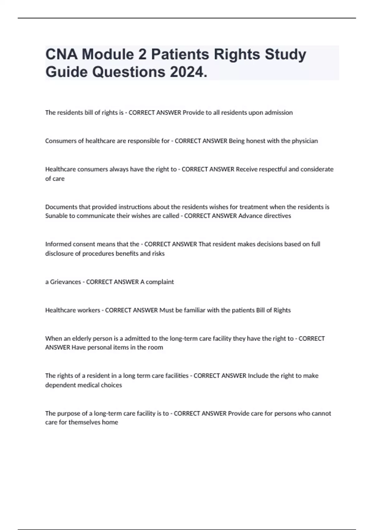 CNA Module 2 Patients Rights Complete Study Questions 2024. The residents bill of rights is - CORRECT ANSWER Provide to all residents upon admission Consumers of healthcare are responsible for - CORRECT ANSWER Being honest with the physician Healthcare consumers always have the right to - CORRECT ANSWER Receive respectful and considerate of care Documents that provided instructions about the residents wishes for treatment when the residents is Sunable to communicate their wishes are called - CORRECT ANSWER Advance directives Informed consent means that the - CORRECT ANSWER That resident makes decisions based on full disclosure of procedures benefits and risks a Grievances - CORRECT ANSWER A complaint Healthcare workers - CORRECT ANSWER Must be familiar with the patients Bill of Rights When an elderly person is a admitted to the long-term care facility they have the right to - CORRECT ANSWER Have personal items in the room The rights of a resident in a long term care facilities - CORRECT ANSWER Include the right to make dependent medical choices The purpose of a long-term care facility is to - CORRECT ANSWER Provide care for persons who cannot care for themselves home