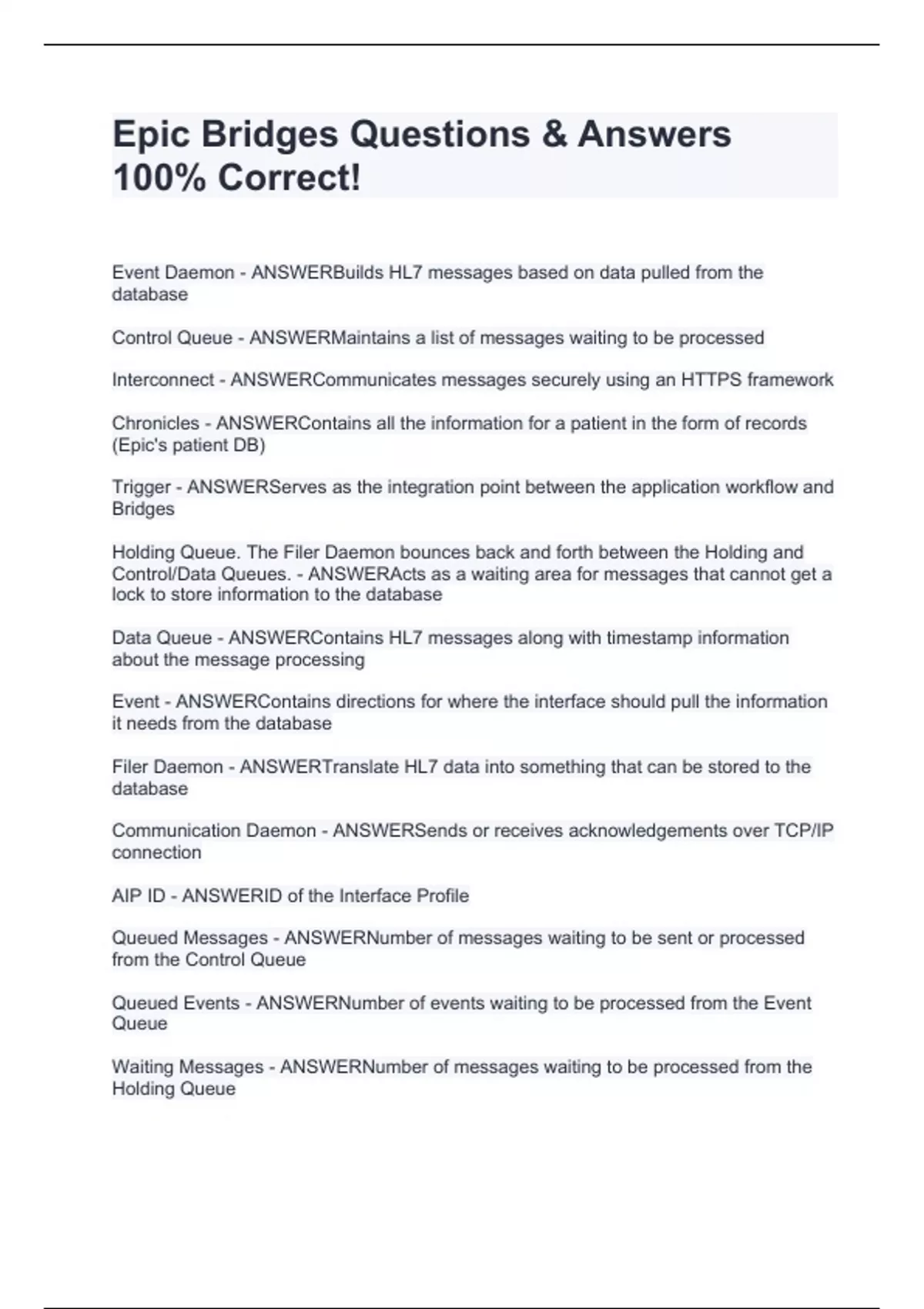 Event Daemon - ANSWERBuilds HL7 messages based on data pulled from the database Control Queue - ANSWERMaintains a list of messages waiting to be processed Interconnect - ANSWERCommunicates messages securely using an HTTPS framework Chronicles - ANSWERContains all the information for a patient in the form of records (Epic's patient DB) Trigger - ANSWERServes as the integration point between the application workflow and Bridges Holding Queue. The Filer Daemon bounces back and forth between the Holding and Control/Data Queues. - ANSWERActs as a waiting area for messages that cannot get a lock to store information to the database Data Queue - ANSWERContains HL7 messages along with timestamp information about the message processing Event - ANSWERContains directions for where the interface should pull the information it needs from the database Filer Daemon - ANSWERTranslate HL7 data into something that can be stored to the database Communication Daemon - ANSWERSends or receives acknowledgements over TCP/IP connection AIP ID - ANSWERID of the Interface Profile Queued Messages - ANSWERNumber of messages waiting to be sent or processed from the Control Queue Queued Events - ANSWERNumber of events waiting to be processed from the Event Queue Waiting Messages - ANSWERNumber of messages waiting to be processed from the Holding Queue Filer/Event Status - ANSWERWhether the Event Daemon or Filer Daemon is Stopped or Running