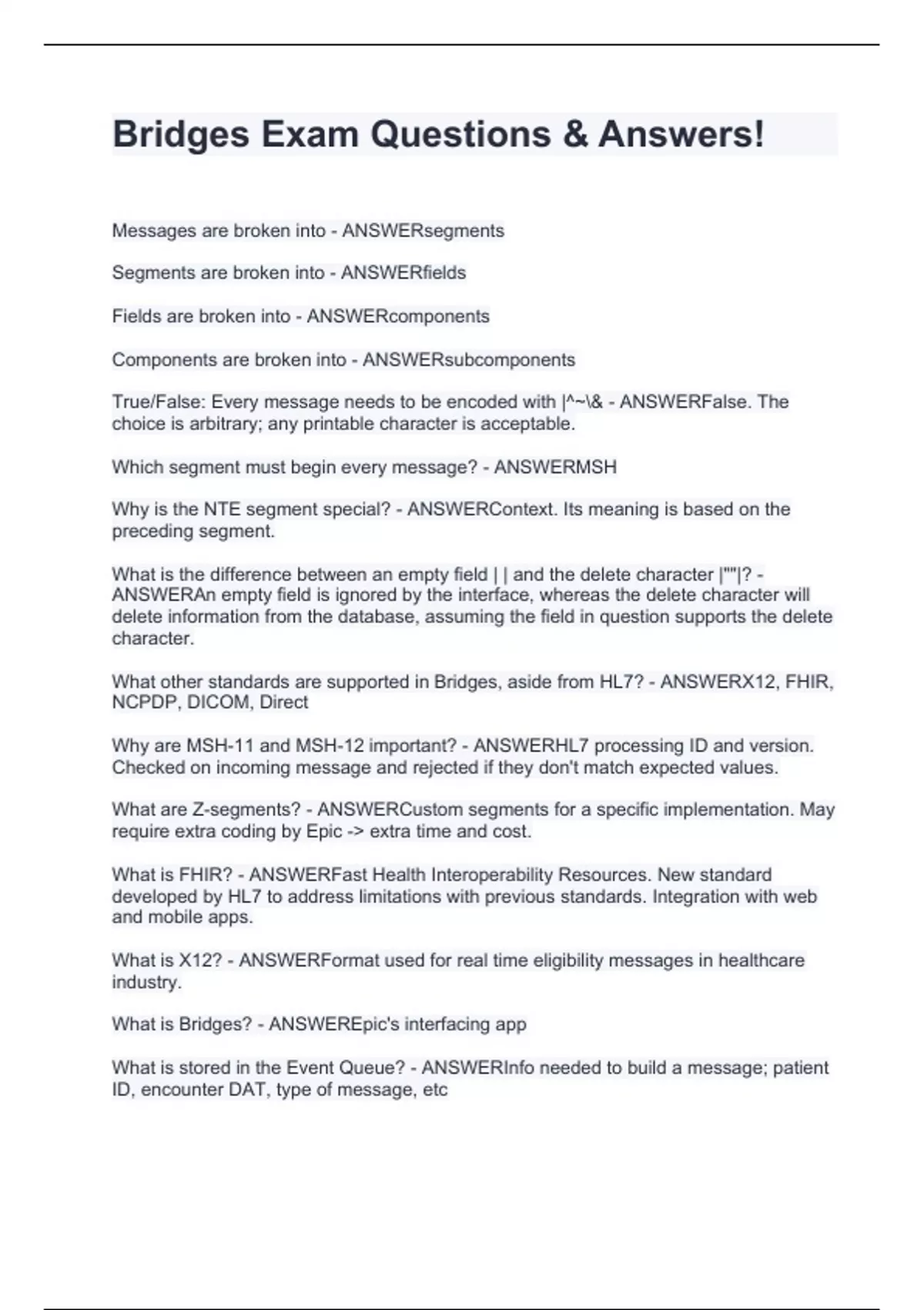 Messages are broken into - ANSWERsegments Segments are broken into - ANSWERfields Fields are broken into - ANSWERcomponents Components are broken into - ANSWERsubcomponents True/False: Every message needs to be encoded with |^~& - ANSWERFalse. The choice is arbitrary; any printable character is acceptable. Which segment must begin every message? - ANSWERMSH Why is the NTE segment special? - ANSWERContext. Its meaning is based on the preceding segment. What is the difference between an empty field | | and the delete character |""|? - ANSWERAn empty field is ignored by the interface, whereas the delete character will delete information from the database, assuming the field in question supports the delete character. What other standards are supported in Bridges, aside from HL7? - ANSWERX12, FHIR, NCPDP, DICOM, Direct Why are MSH-11 and MSH-12 important? - ANSWERHL7 processing ID and version. Checked on incoming message and rejected if they don't match expected values. What are Z-segments? - ANSWERCustom segments for a specific implementation. May require extra coding by Epic -> extra time and cost. What is FHIR? - ANSWERFast Health Interoperability Resources. New standard developed by HL7 to address limitations with previous standards. Integration with web and mobile apps. What is X12? - ANSWERFormat used for real time eligibility messages in healthcare industry. What is Bridges? - ANSWEREpic's interfacing app What is stored in the Event Queue? - ANSWERInfo needed to build a message; patient ID, encounter DAT, type of message, etc W