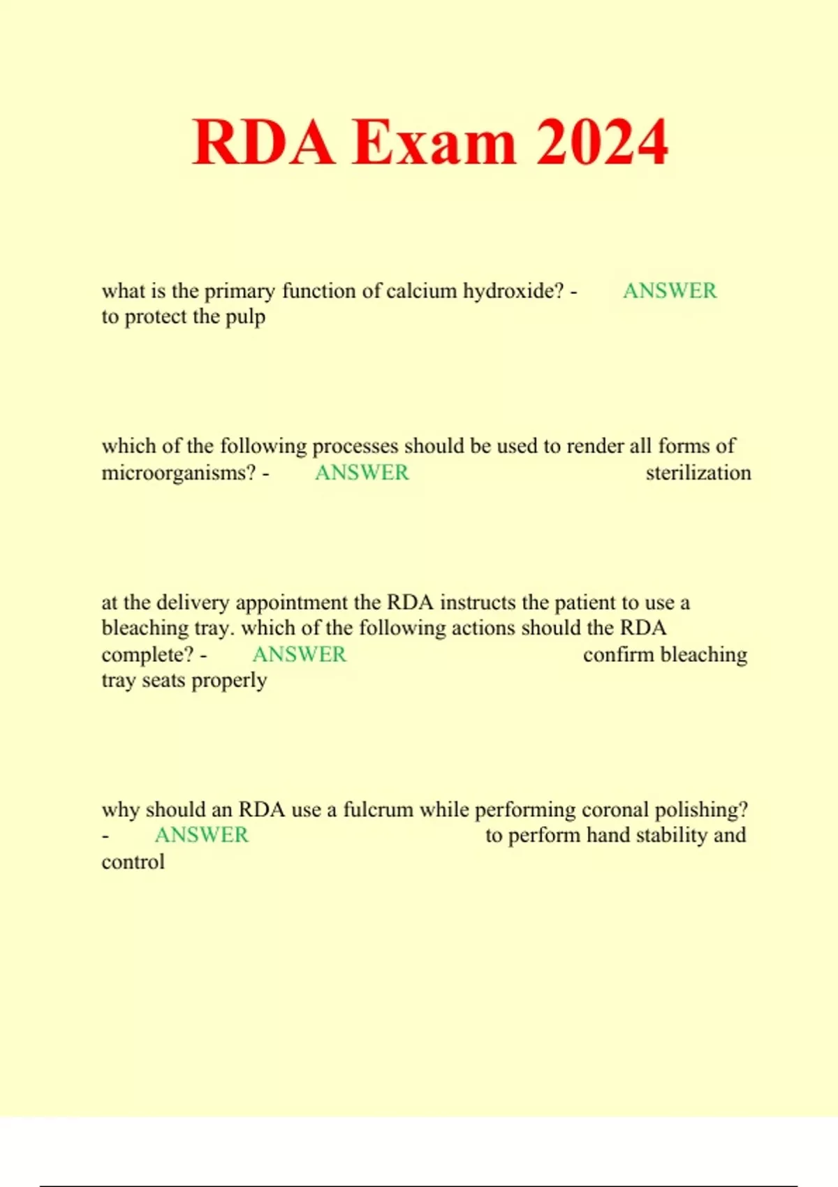 RDA Exam 2024 what is the primary function of calcium hydroxide? - ANSWER to protect the pulp which of the following processes should be used to render all forms of microorganisms? - ANSWER sterilization at the delivery appointment the RDA instructs the patient to use a bleaching tray. which of the following actions should the RDA complete? - ANSWER confirm bleaching tray seats properly why should an RDA use a fulcrum while performing coronal polishing? - ANSWER to perform hand stability and control which of the following procedures should an RDA take to reduce microfilm multiplication before putting on gloves? - ANSWER use rubbing alcohol hand rub