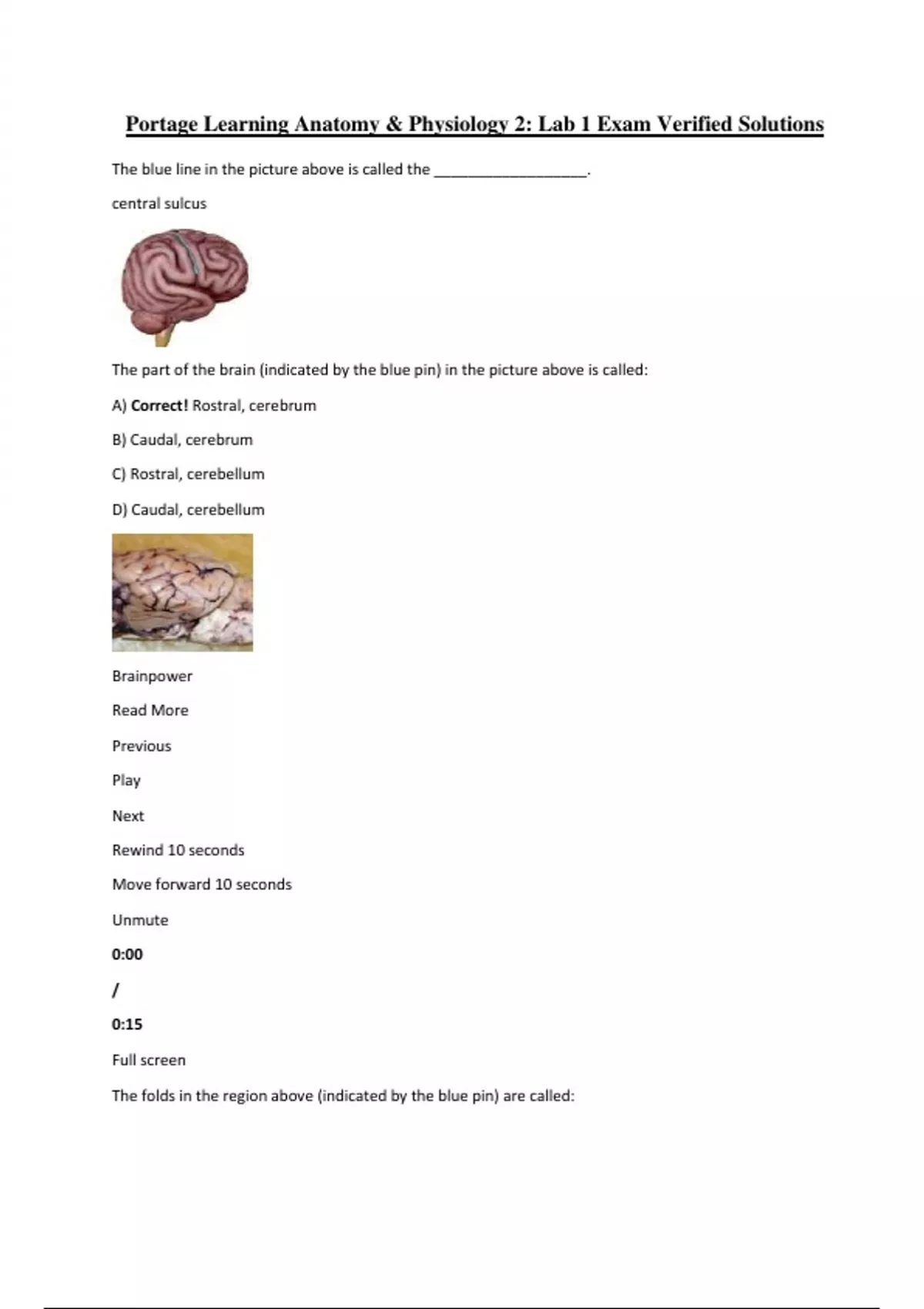 Portage Learning Anatomy & Physiology 2: Lab 1 Exam Verified Solutions The blue line in the picture above is called the __________________. central sulcus The part of the brain (indicated by the blue pin) in the picture above is called: A) Correct! Rostral, cerebrum B) Caudal, cerebrum C) Rostral, cerebellum D) Caudal, cerebellum Brainpower Read More Previous Play Next Rewind 10 seconds Move forward 10 seconds Unmute 0:00 / 0:15 Full screen The folds in the region above (indicated by the blue pin) are called: Folia Injury to the area of the brain above (indicated by the blue arrow) would most likely cause impaired: A) Motor planning B) Correct Answer Interpreting of general senses C) Vision D) Hearing and Smell E) Motor coordination Damage to the region (indicated by the pin, above) causes what movement disorder? ataxic movement This region of the brain acts a sensory relay station: A. Diencephalon (Thalamus) B. Midbrain C. Pons D. medulla oblongota These ventricles are in the cerebral hemispheres. A) Correct Answer: Lateral B) Third C) Fourth D) Fifth Damage to the cranial nerve (highlighted in blue, above) causes: ____. Damage to oculomotor III causes drooping eyelids or the eyeball will rest in the lateral position. The motor branch of the cranial nerve (highlighted in blue, above) enables what movements? The mandibular branch of the trigeminal nerve controls mastication or chewing. The cranial nerve (highlighted in blue, above) enables what movements? The abducens nerve is responsible for lateral eye movement. The cranial nerve highlighted in blue, above: A) the largest cranial nerve. B) Correct! has a motor branch enabling facial expressions. C) has a motor branch that causes the gag reflex. D) has a sensory branch detecting gastrointestinal discomfort. E) has a sensory branch detecting balance. Damage to the cranial nerve highlighted in blue, above causes: