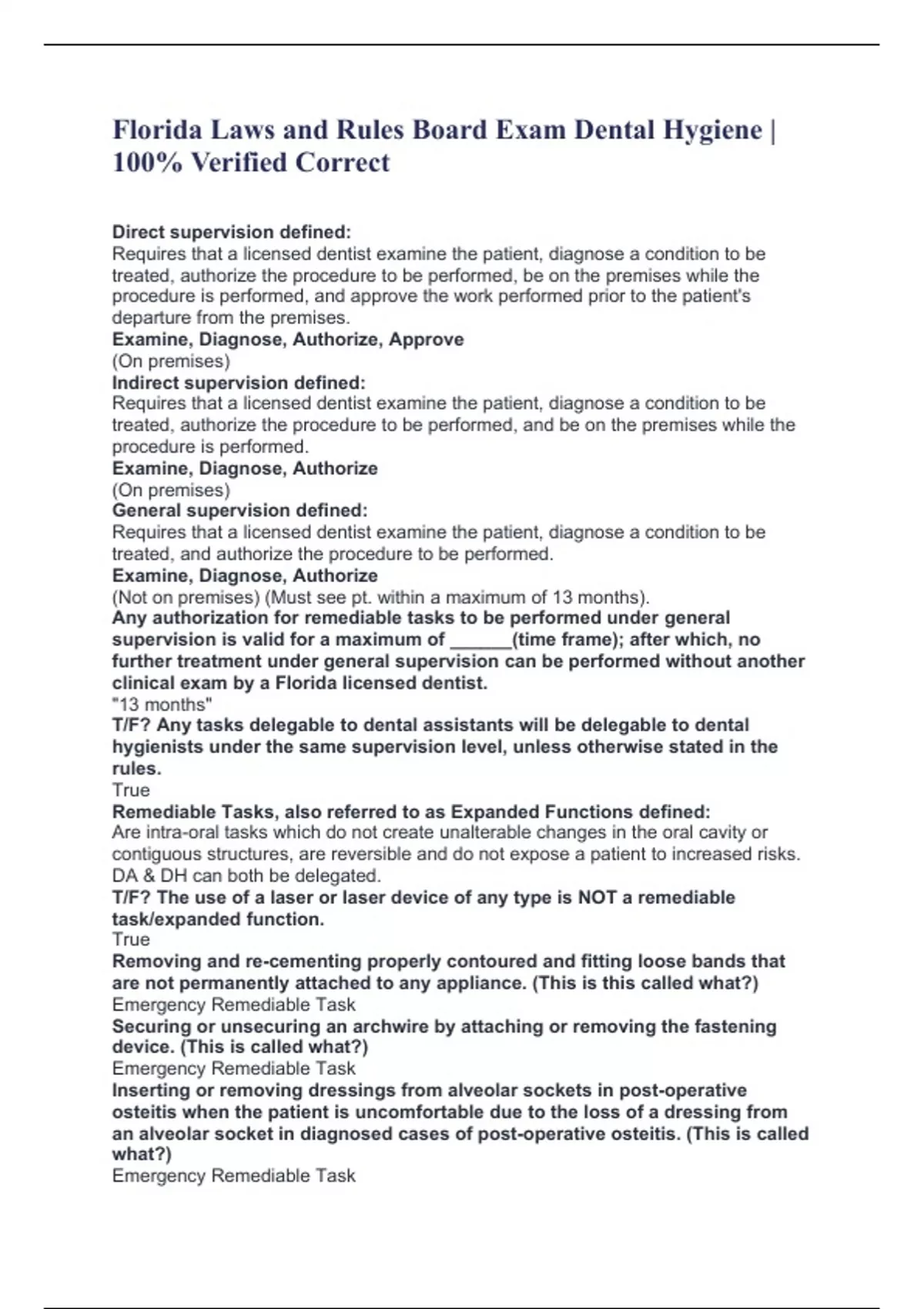 Florida Laws and Rules Board Exam Dental Hygiene |100% Verified Correct Direct supervision defined: Requires that a licensed dentist examine the patient, diagnose a condition to be treated, authorize the procedure to be performed, be on the premises while the procedure is performed, and approve the work performed prior to the patient's departure from the premises. Examine, Diagnose, Authorize, Approve (On premises) Indirect supervision defined: Requires that a licensed dentist examine the patient, diagnose a condition to be treated, authorize the procedure to be performed, and be on the premises while the procedure is performed. Examine, Diagnose, Authorize (On premises) General supervision defined: Requires that a licensed dentist examine the patient, diagnose a condition to be treated, and authorize the procedure to be performed. Examine, Diagnose, Authorize (Not on premises) (Must see pt. within a maximum of 13 months). Any authorization for remediable tasks to be performed under general supervision is valid for a maximum of ______(time frame); after which, no further treatment under general supervision can be performed without another clinical exam by a Florida licensed dentist. "13 months" T/F? Any tasks delegable to dental assistants will be delegable to dental hygienists under the same supervision level, unless otherwise stated in the rules. True Remediable Tasks, also referred to as Expanded Functions defined: Are intra-oral tasks which do not create unalterable changes in the oral cavity or contiguous structures, are reversible and do not expose a patient to increased risks. DA & DH can both be delegated. T/F? The use of a laser or laser device of any type is NOT a remediable task/expanded function. True Removing and re-cementing properly contoured and fitting loose bands that are not permanently attached to any appliance. (This is this called what?) Emergency Remediable Task Securing or unsecuring an archwire by attaching or removing the fastening device. (This is called what?) Emergency Remediable Task Inserting or removing dressings from alveolar sockets in post-operative osteitis when the patient is uncomfortable due to the loss of a dressing from an alveolar socket in diagnosed cases of post-operative osteitis. (This is called what?) Emergency Remediable Task
