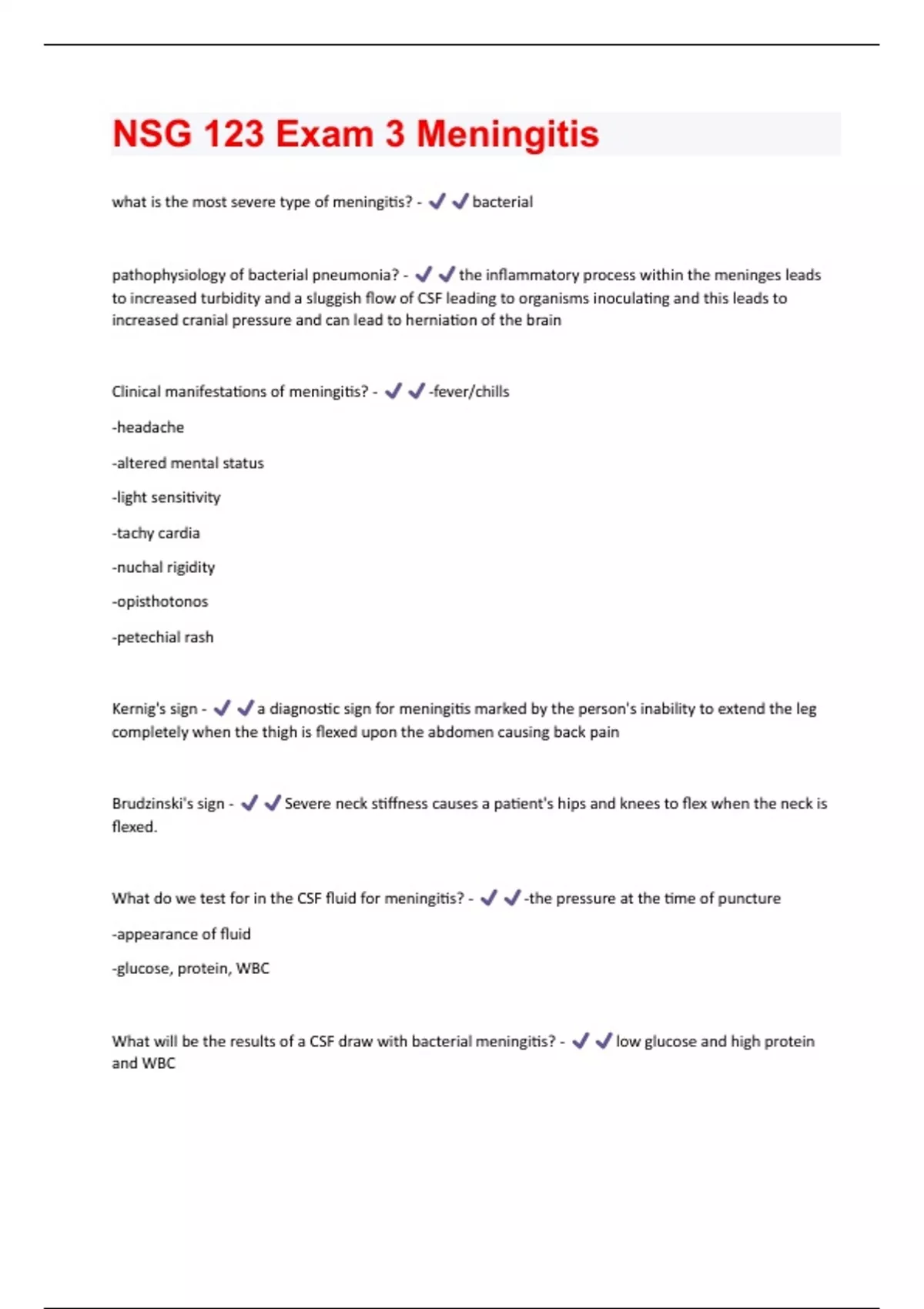 NSG 123 Exam 3 Meningitis Questions and Answers 100% Solved correctly
