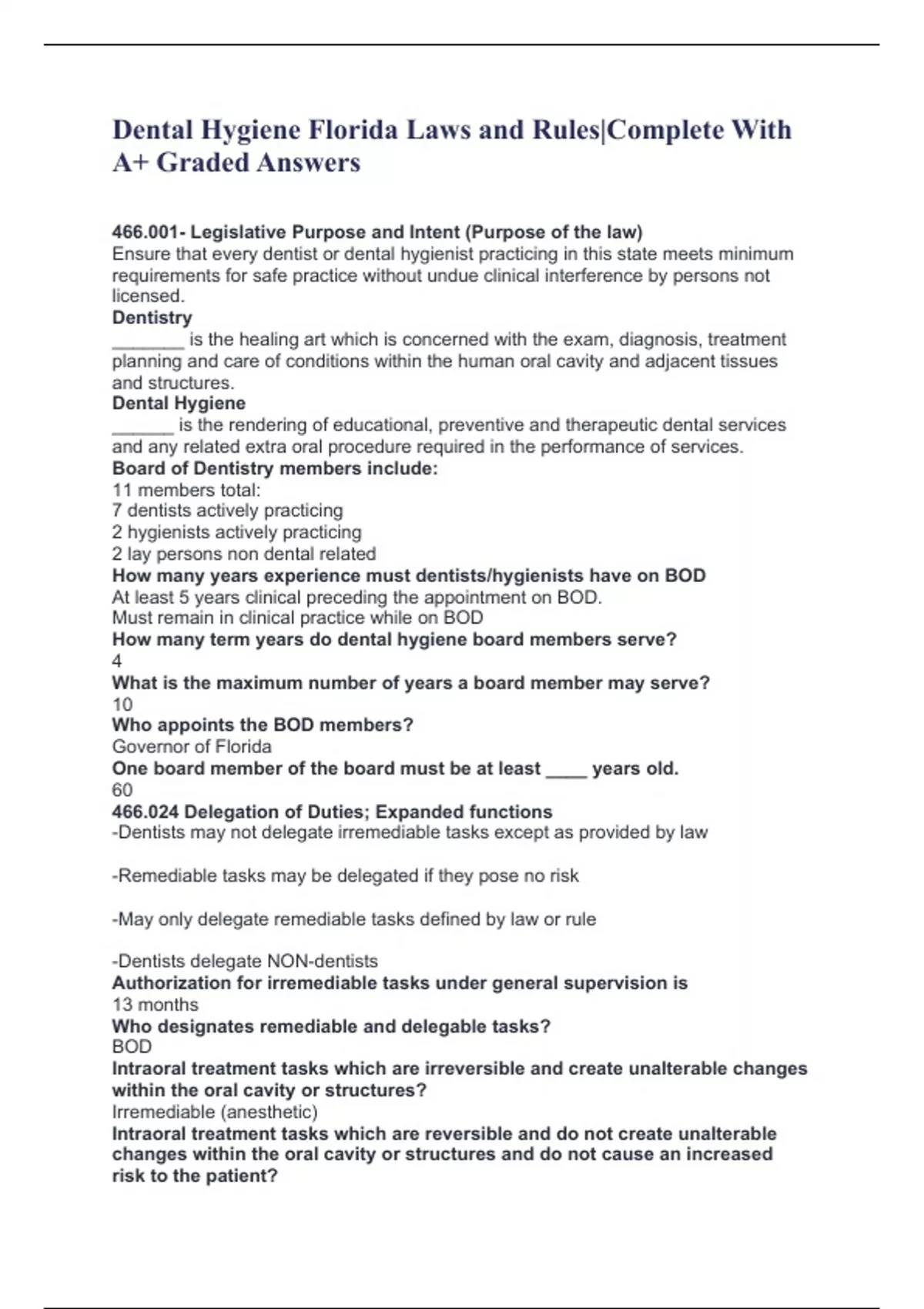 Dental Hygiene Florida Laws and Rules|Complete With A+ Graded Answers 466.001- Legislative Purpose and Intent (Purpose of the law) Ensure that every dentist or dental hygienist practicing in this state meets minimum requirements for safe practice without undue clinical interference by persons not licensed. Dentistry _______ is the healing art which is concerned with the exam, diagnosis, treatment planning and care of conditions within the human oral cavity and adjacent tissues and structures. Dental Hygiene ______ is the rendering of educational, preventive and therapeutic dental services and any related extra oral procedure required in the performance of services. Board of Dentistry members include: 11 members total: 7 dentists actively practicing 2 hygienists actively practicing 2 lay persons non dental related How many years experience must dentists/hygienists have on BOD At least 5 years clinical preceding the appointment on BOD. Must remain in clinical practice while on BOD How many term years do dental hygiene board members serve? 4 What is the maximum number of years a board member may serve? 10 Who appoints the BOD members? Governor of Florida One board member of the board must be at least ____ years old. 60 466.024 Delegation of Duties; Expanded functions -Dentists may not delegate irremediable tasks except as provided by law -Remediable tasks may be delegated if they pose no risk -May only delegate remediable tasks defined by law or rule -Dentists delegate NON-dentists Authorization for irremediable tasks under general supervision is 13 months Who designates remediable and delegable tasks? BOD Intraoral treatment tasks which are irreversible and create unalterable changes within the oral cavity or structures? Irremediable (anesthetic) Intraoral treatment tasks which are reversible and do not create unalterable changes within the oral cavity or structures and do not cause an increased risk to the patient?