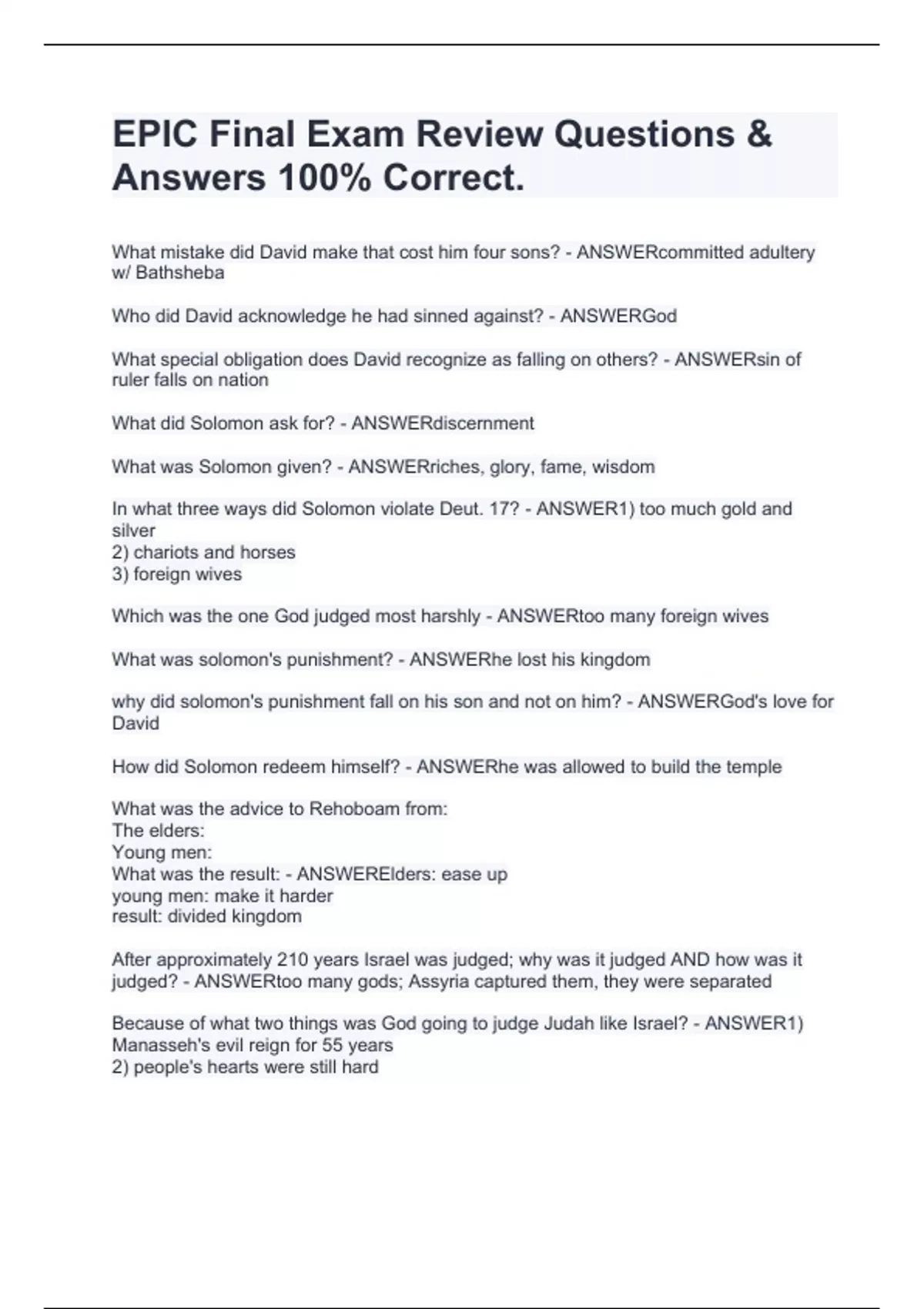 What mistake did David make that cost him four sons? - ANSWERcommitted adultery w/ Bathsheba Who did David acknowledge he had sinned against? - ANSWERGod What special obligation does David recognize as falling on others? - ANSWERsin of ruler falls on nation What did Solomon ask for? - ANSWERdiscernment What was Solomon given? - ANSWERriches, glory, fame, wisdom In what three ways did Solomon violate Deut. 17? - ANSWER1) too much gold and silver 2) chariots and horses 3) foreign wives Which was the one God judged most harshly - ANSWERtoo many foreign wives What was solomon's punishment? - ANSWERhe lost his kingdom why did solomon's punishment fall on his son and not on him? - ANSWERGod's love for David How did Solomon redeem himself? - ANSWERhe was allowed to build the temple What was the advice to Rehoboam from: The elders: Young men: What was the result: - ANSWERElders: ease up young men: make it harder result: divided kingdom After approximately 210 years Israel was judged; why was it judged AND how was it judged? - ANSWERtoo many gods; Assyria captured them, they were separated Because of what two things was God going to judge Judah like Israel? - ANSWER1) Manasseh's evil reign for 55 years 2) people's hearts were still hard What is the if-then relationship found in Lev. 26 - ANSWER"If you do not obey me, then I will destroy you." What two things happened as a result of Lev. 26? - ANSWER1) complete destruction of Jerusalem