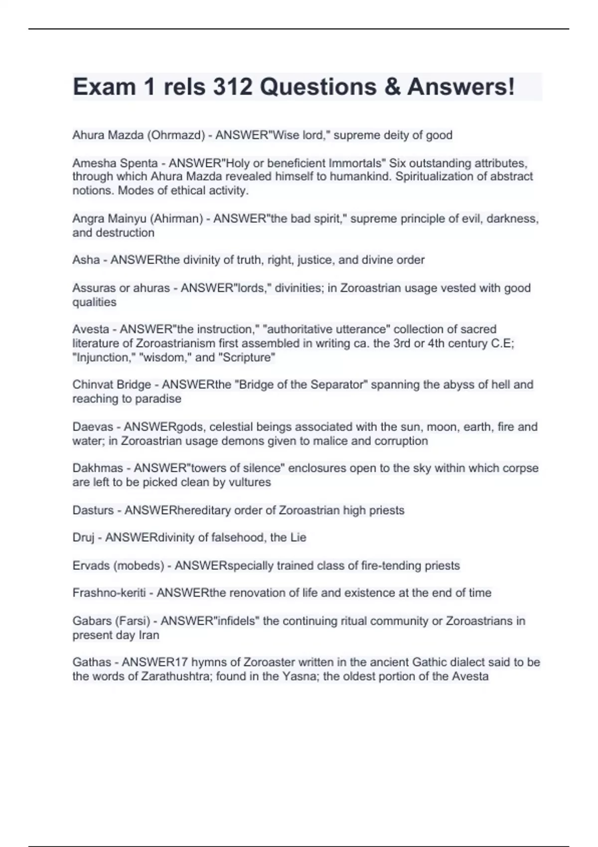 Ahura Mazda (Ohrmazd) - ANSWER"Wise lord," supreme deity of good Amesha Spenta - ANSWER"Holy or beneficient Immortals" Six outstanding attributes, through which Ahura Mazda revealed himself to humankind. Spiritualization of abstract notions. Modes of ethical activity. Angra Mainyu (Ahirman) - ANSWER"the bad spirit," supreme principle of evil, darkness, and destruction Asha - ANSWERthe divinity of truth, right, justice, and divine order Assuras or ahuras - ANSWER"lords," divinities; in Zoroastrian usage vested with good qualities Avesta - ANSWER"the instruction," "authoritative utterance" collection of sacred literature of Zoroastrianism first assembled in writing ca. the 3rd or 4th century C.E; "Injunction," "wisdom," and "Scripture" Chinvat Bridge - ANSWERthe "Bridge of the Separator" spanning the abyss of hell and reaching to paradise Daevas - ANSWERgods, celestial beings associated with the sun, moon, earth, fire and water; in Zoroastrian usage demons given to malice and corruption Dakhmas - ANSWER"towers of silence" enclosures open to the sky within which corpse are left to be picked clean by vultures Dasturs - ANSWERhereditary order of Zoroastrian high priests Druj - ANSWERdivinity of falsehood, the Lie Ervads (mobeds) - ANSWERspecially trained class of fire-tending priests Frashno-keriti - ANSWERthe renovation of life and existence at the end of time Gabars (Farsi) - ANSWER"infidels" the continuing ritual community or Zoroastrians in present day Iran Gathas - ANSWER17 hymns of Zoroaster written in the ancient Gathic dialect said to be the words of Zarathushtra; found in the Yasna; the oldest portion of the Avesta