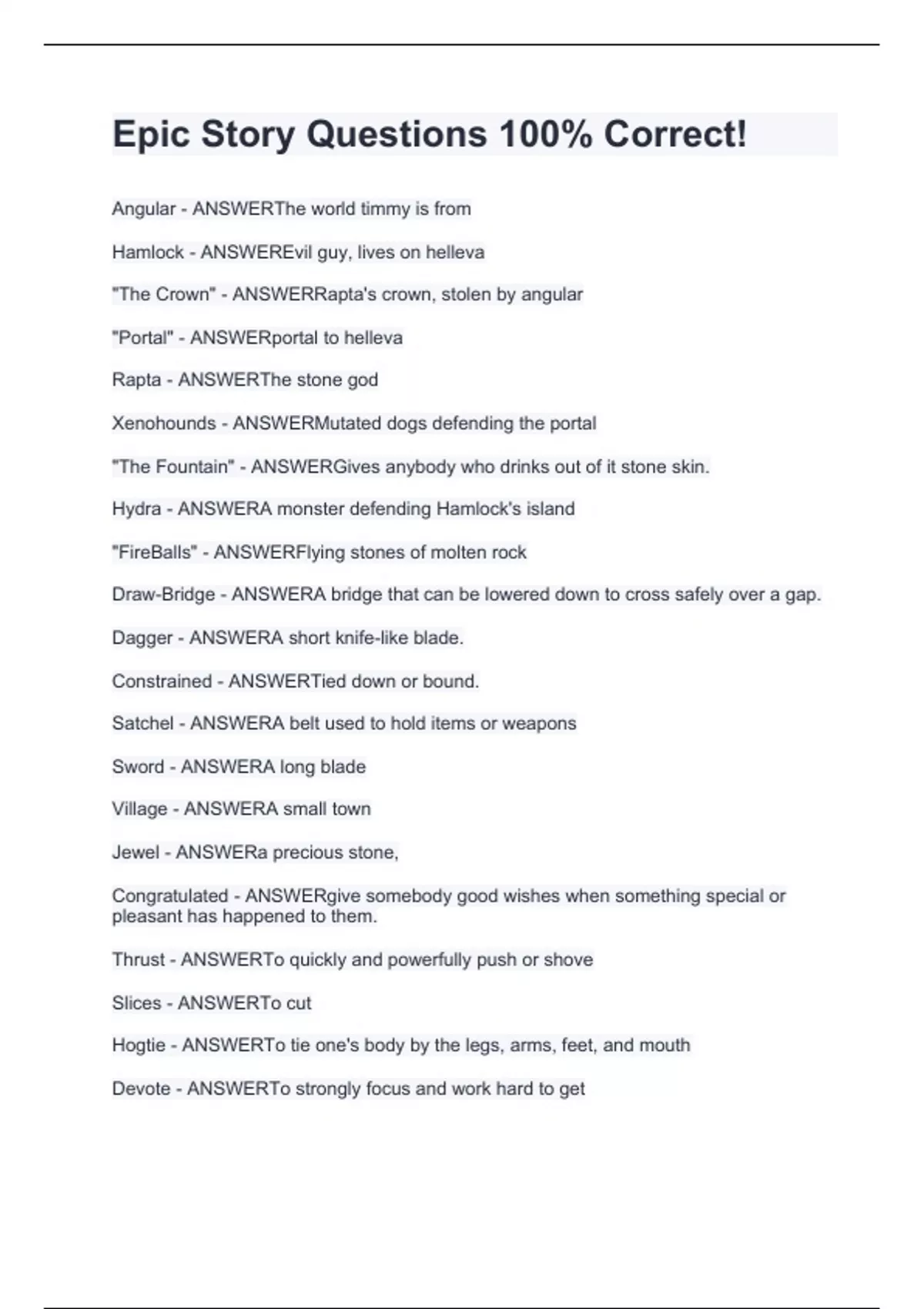 Angular - ANSWERThe world timmy is from Hamlock - ANSWEREvil guy, lives on helleva "The Crown" - ANSWERRapta's crown, stolen by angular "Portal" - ANSWERportal to helleva Rapta - ANSWERThe stone god Xenohounds - ANSWERMutated dogs defending the portal "The Fountain" - ANSWERGives anybody who drinks out of it stone skin. Hydra - ANSWERA monster defending Hamlock's island "FireBalls" - ANSWERFlying stones of molten rock Draw-Bridge - ANSWERA bridge that can be lowered down to cross safely over a gap. Dagger - ANSWERA short knife-like blade. Constrained - ANSWERTied down or bound. Satchel - ANSWERA belt used to hold items or weapons Sword - ANSWERA long blade Village - ANSWERA small town Jewel - ANSWERa precious stone, Congratulated - ANSWERgive somebody good wishes when something special or pleasant has happened to them. Thrust - ANSWERTo quickly and powerfully push or shove Slices - ANSWERTo cut Hogtie - ANSWERTo tie one's body by the legs, arms, feet, and mouth