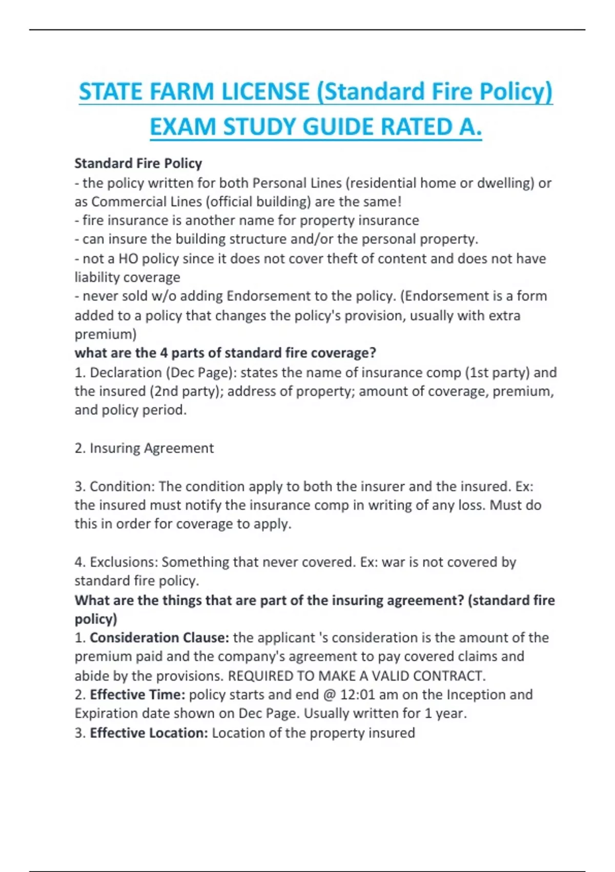 STATE FARM LICENSE (Standard Fire Policy) EXAM STUDY GUIDE RATED A.