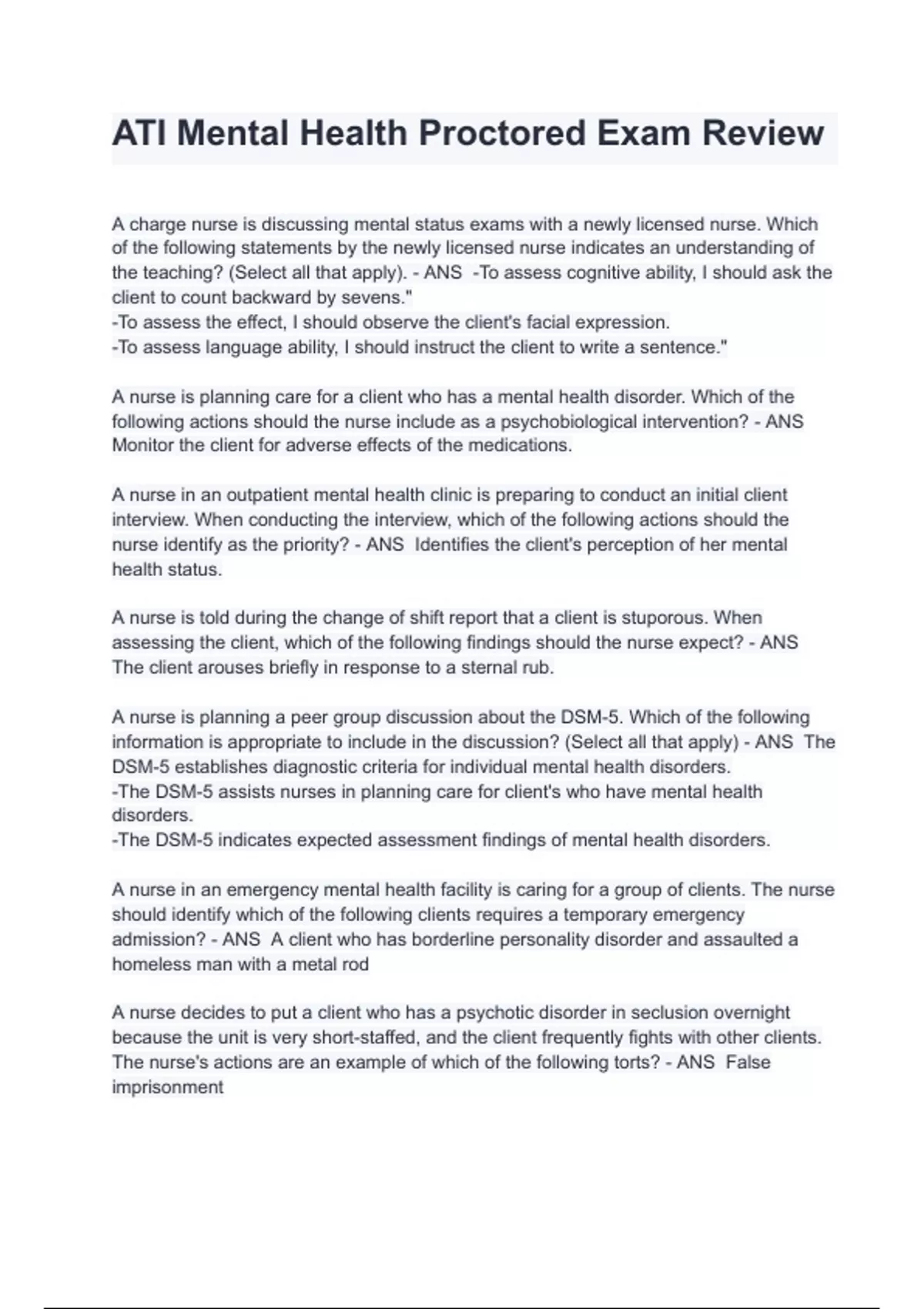 ATI Mental Health Proctored Exam Review 2024/2025 Questions With Already Graded Solutions.