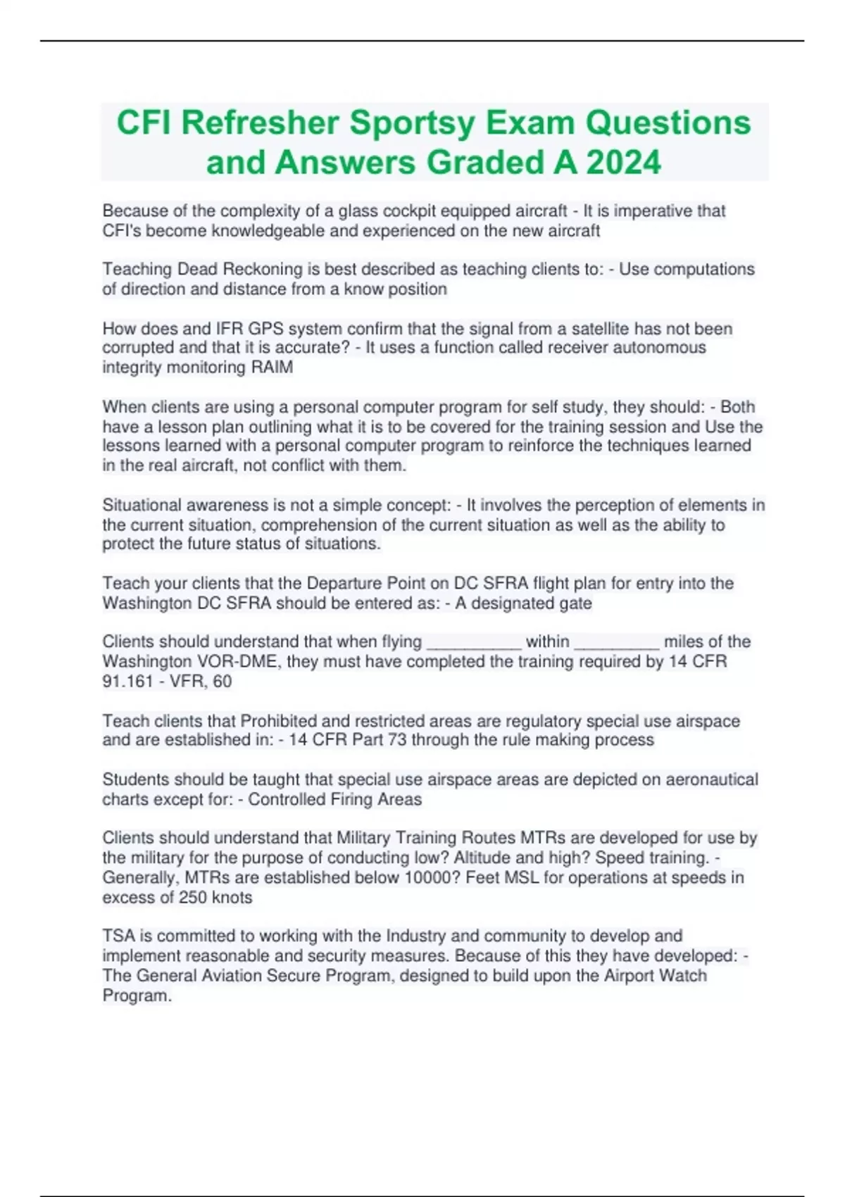 CFI Refresher Sportsy Exam Questions and Answers Graded A 2024